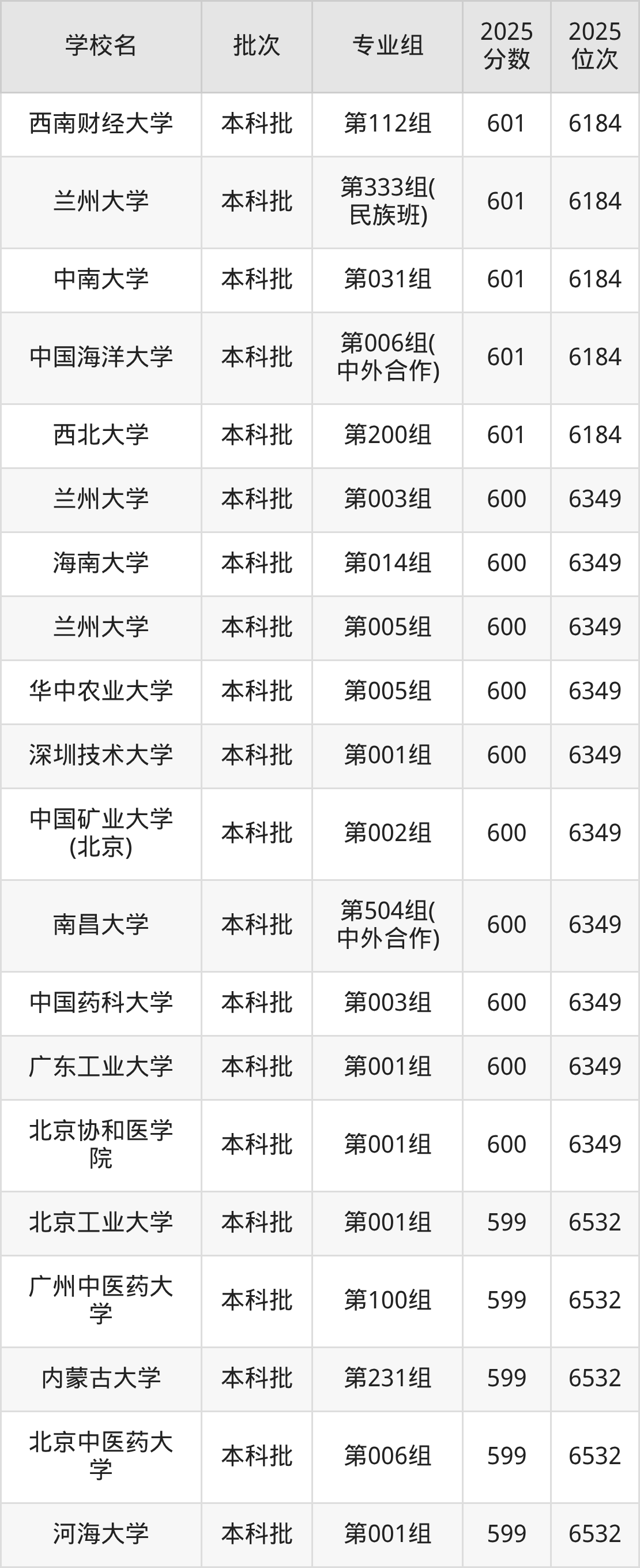 2025年内蒙古高考物理类600分(6185名~6349名)能上的大学有海南大学第014组、中国矿业大学(北京)第002组、深圳技术大学第001组、华中农业大学第005组等。