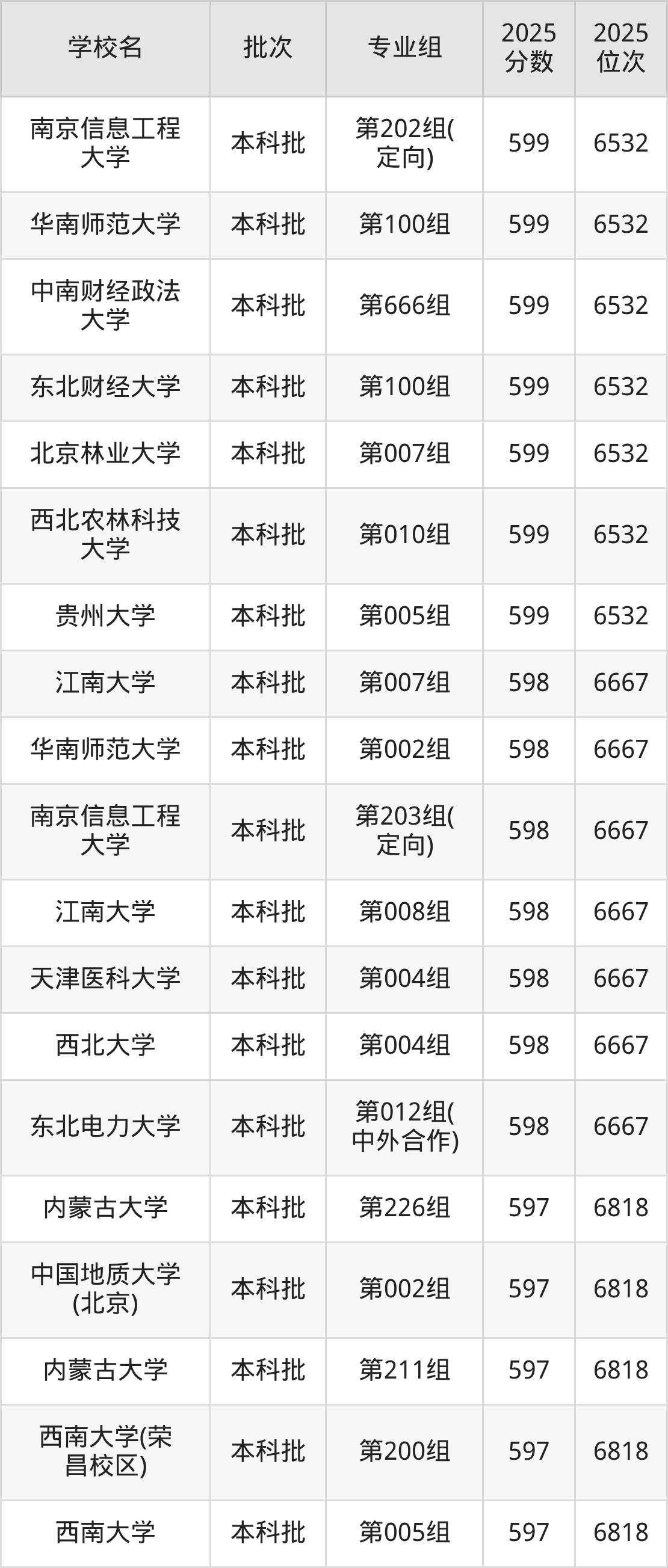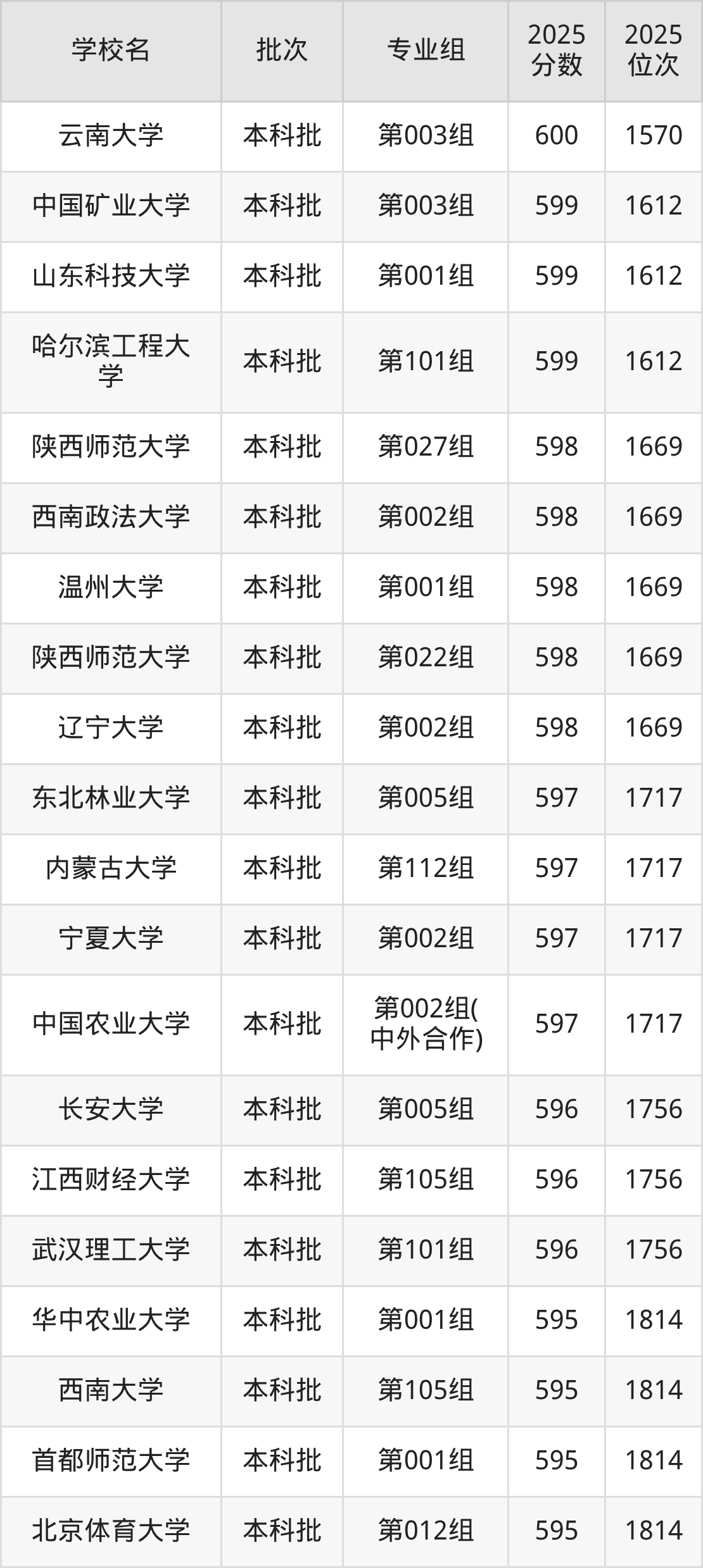 2025年内蒙古高考历史类600分(1531名~1570名)能上的大学有北京信息科技大学第002组、云南大学第003组、东北师范大学第003组(中外合作)。