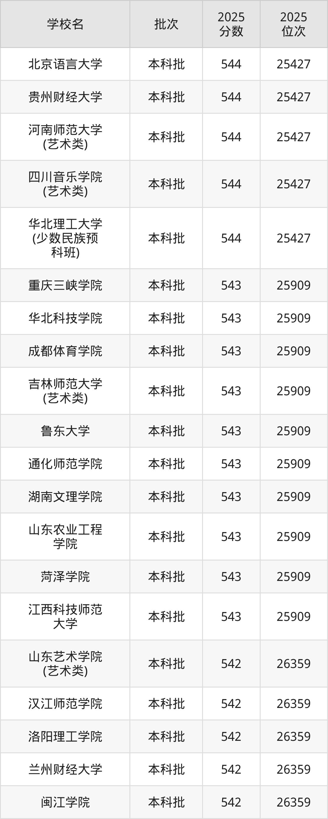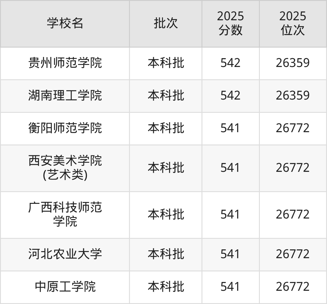 2025年河北高考历史类542分(25910名~26359名)能上的大学有湖南理工学院、贵州师范学院、闽江学院、山东艺术学院(艺术类)等。