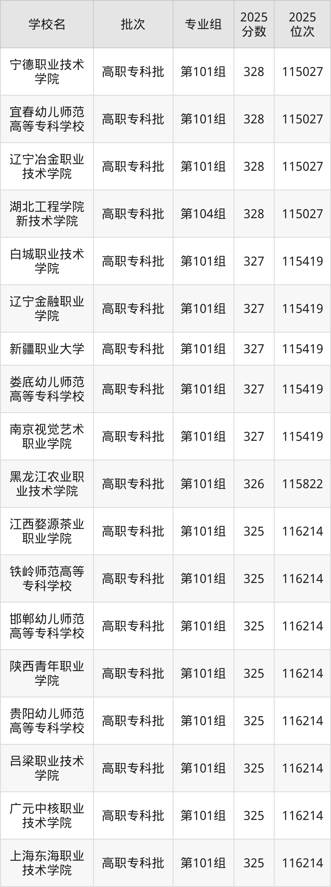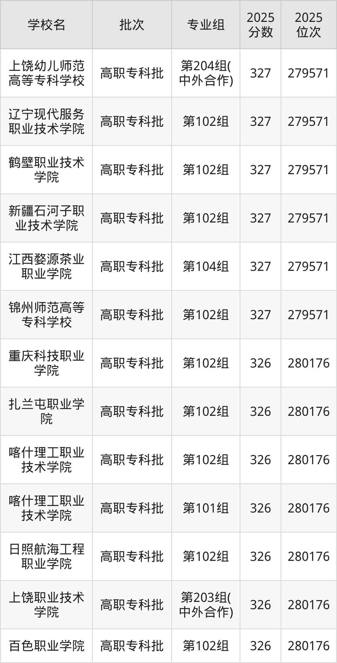 2025年湖南高考物理类326分(279572名~280176名)能上的大学有扎兰屯职业学院第102组、上饶职业技术学院第203组(中外合作)、日照航海工程职业学院第102组、百色职业学院第102组等。