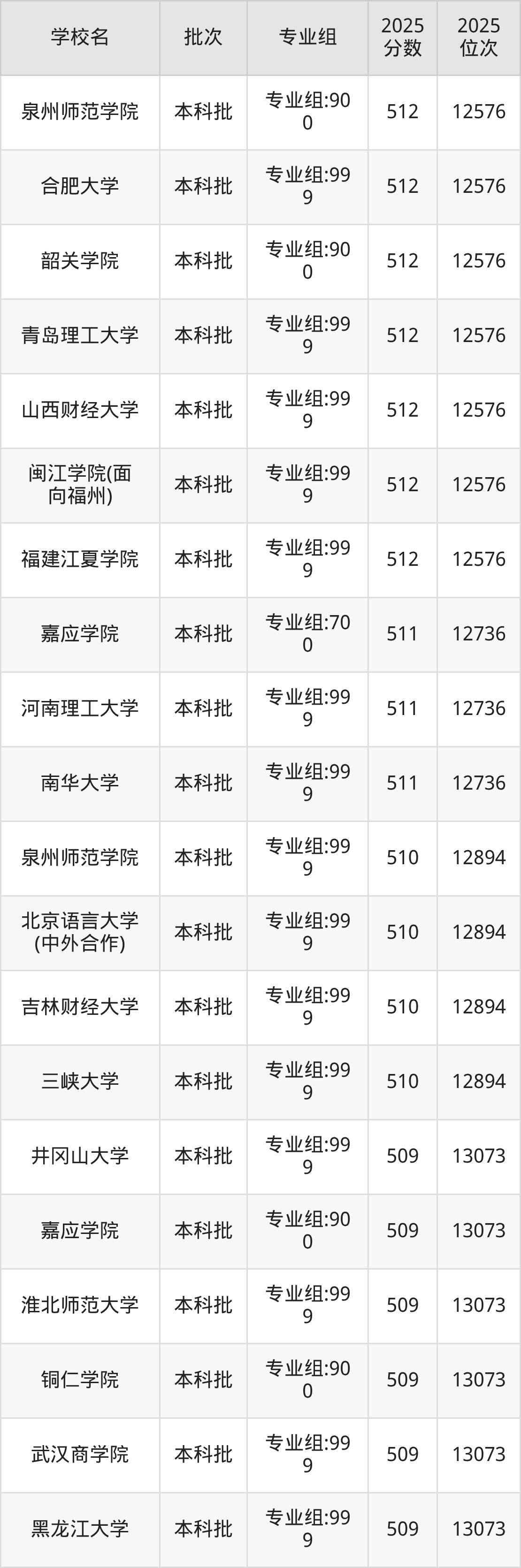 2025年福建高考历史类512分(12413名~12576名)能上的大学有福建江夏学院专业组:999、闽江学院(面向福州)专业组:999、泉州师范学院专业组:900、合肥大学专业组:999等。