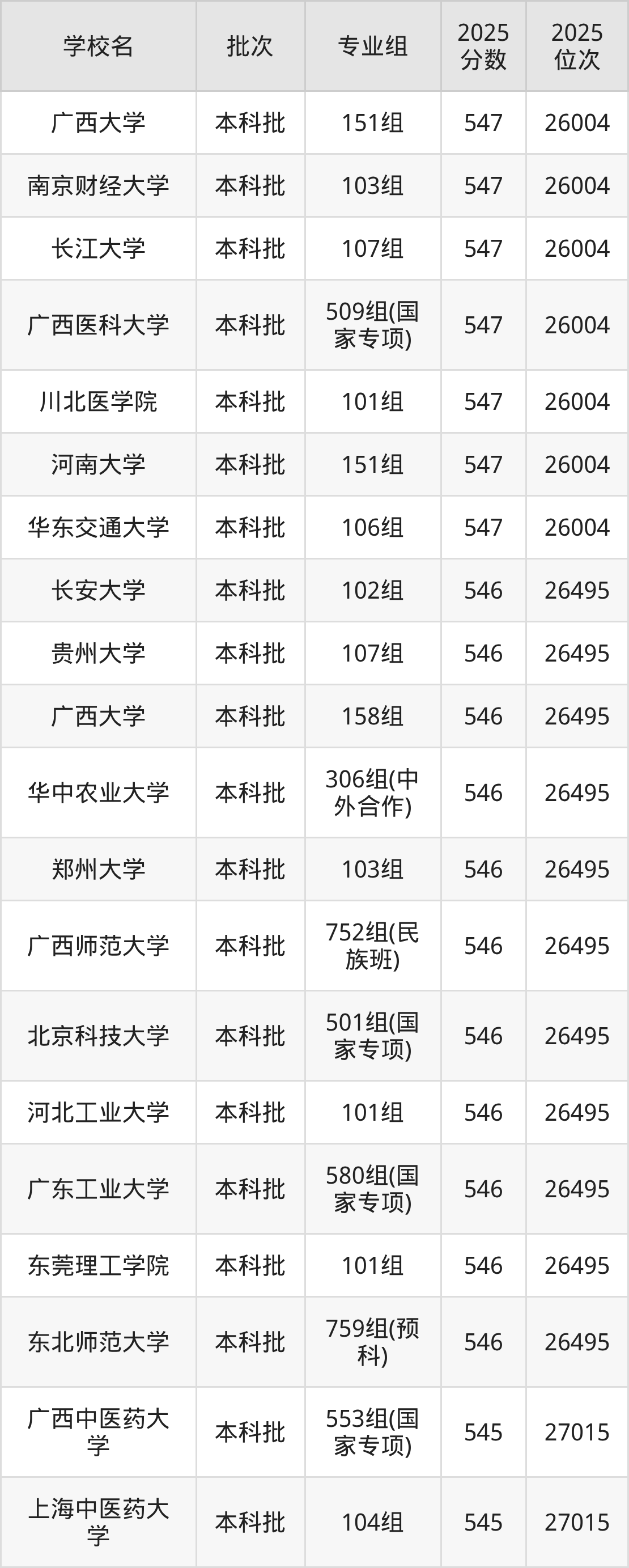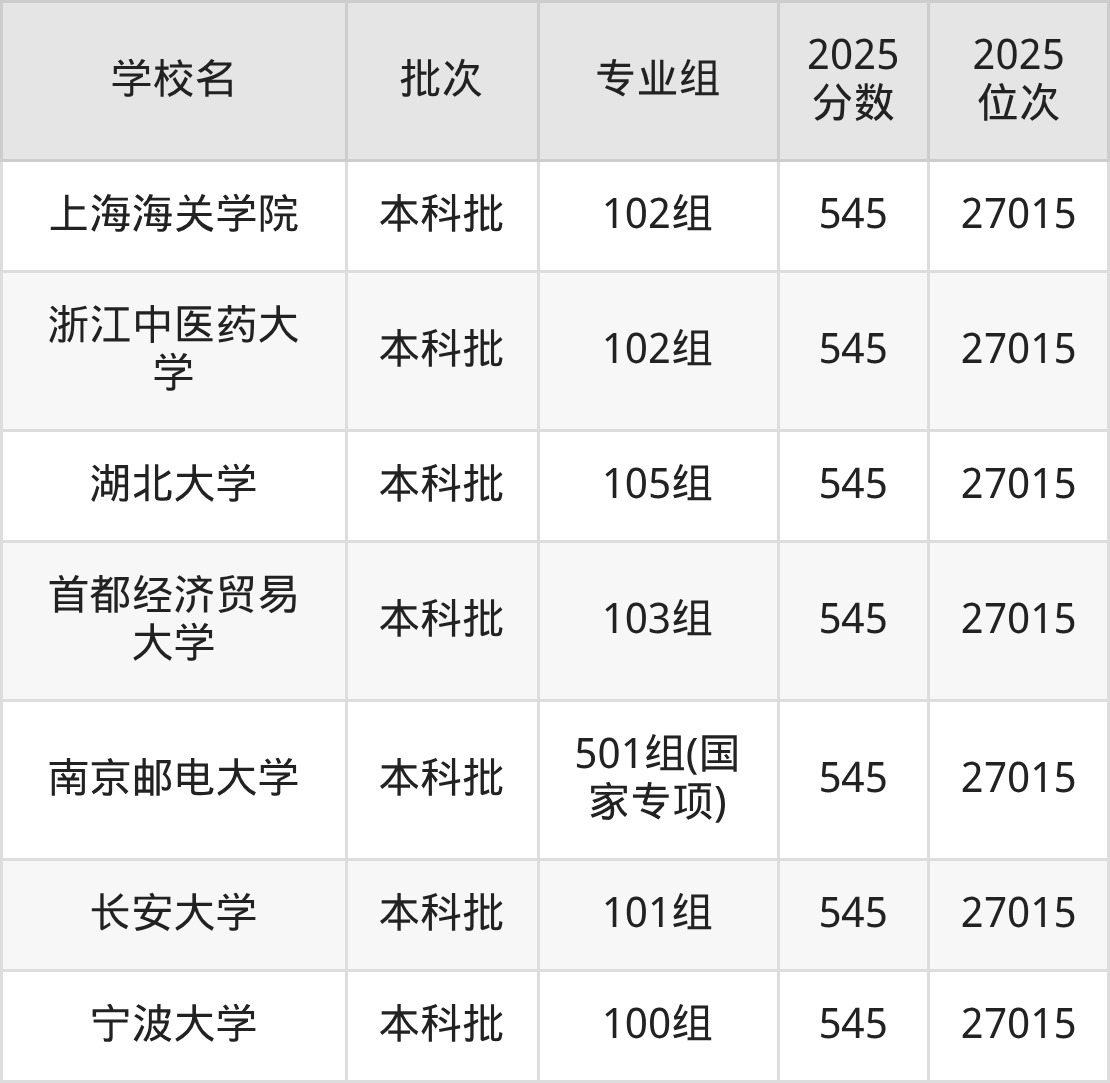 2025年广西高考物理类545分(26496名~27015名)能上的大学有首都经济贸易大学103组、上海中医药大学104组、上海海关学院102组、南京邮电大学501组(国家专项)等。