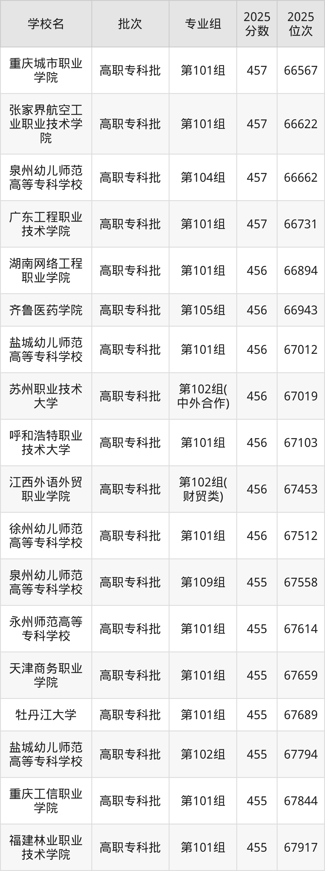 2025年江西高考历史类456分(66860名~67528名)能上的大学有盐城幼儿师范高等专科学校第101组、齐鲁医药学院第105组、湖南网络工程职业学院第101组、苏州职业技术大学第102组(中外合作)等。