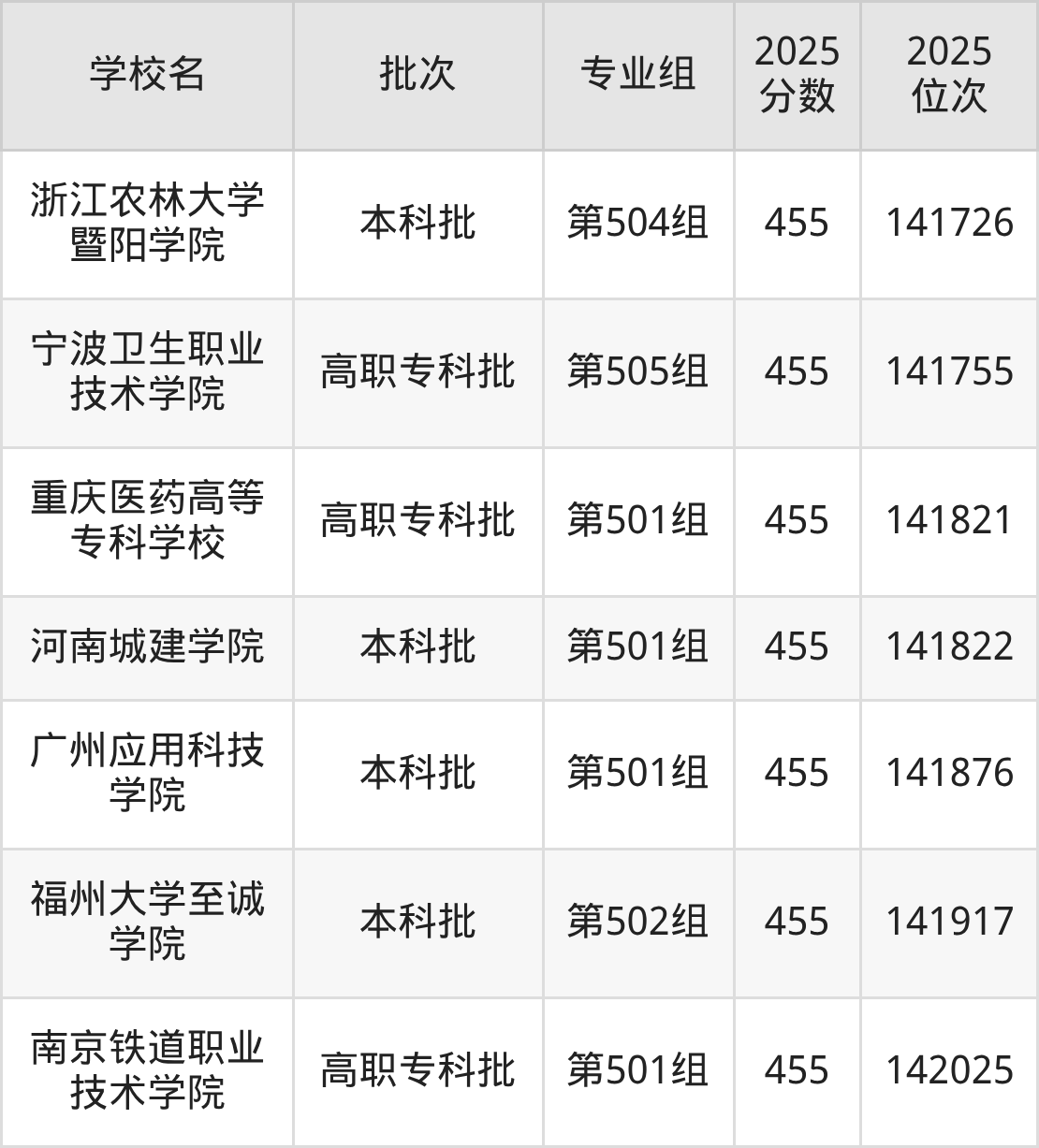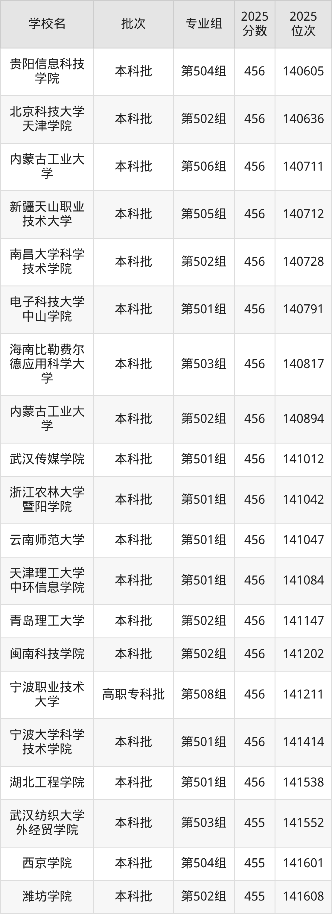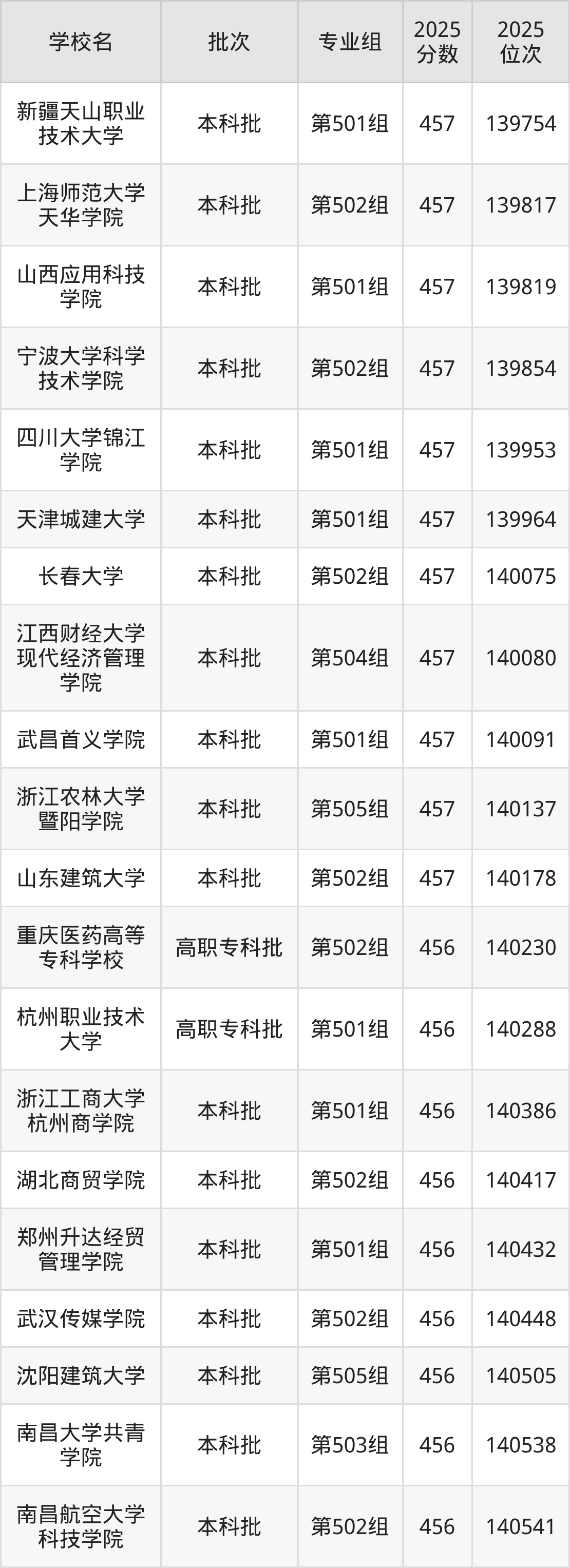 另外录取位次低于该区间(较稳妥)的有武汉纺织大学外经贸学院第503组(141552名)、西京学院第504组(141601名)等;录取位次高于该区间(可冲)的有山东建筑大学第502组(140178名)、浙江农林大学暨阳学院第505组(140137名)等。