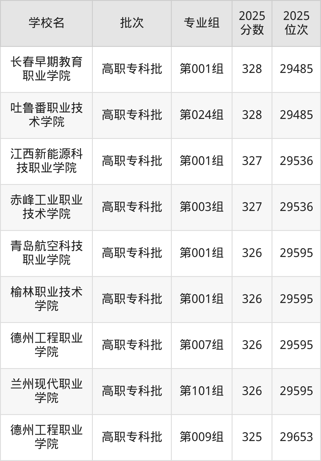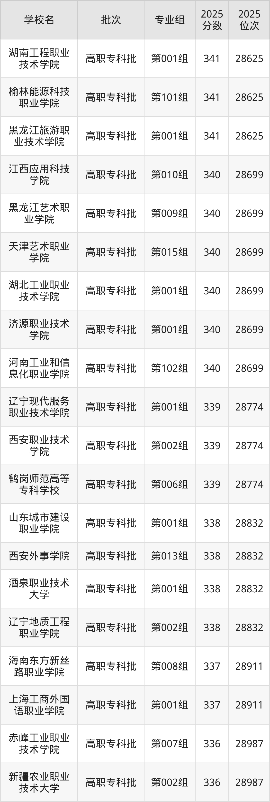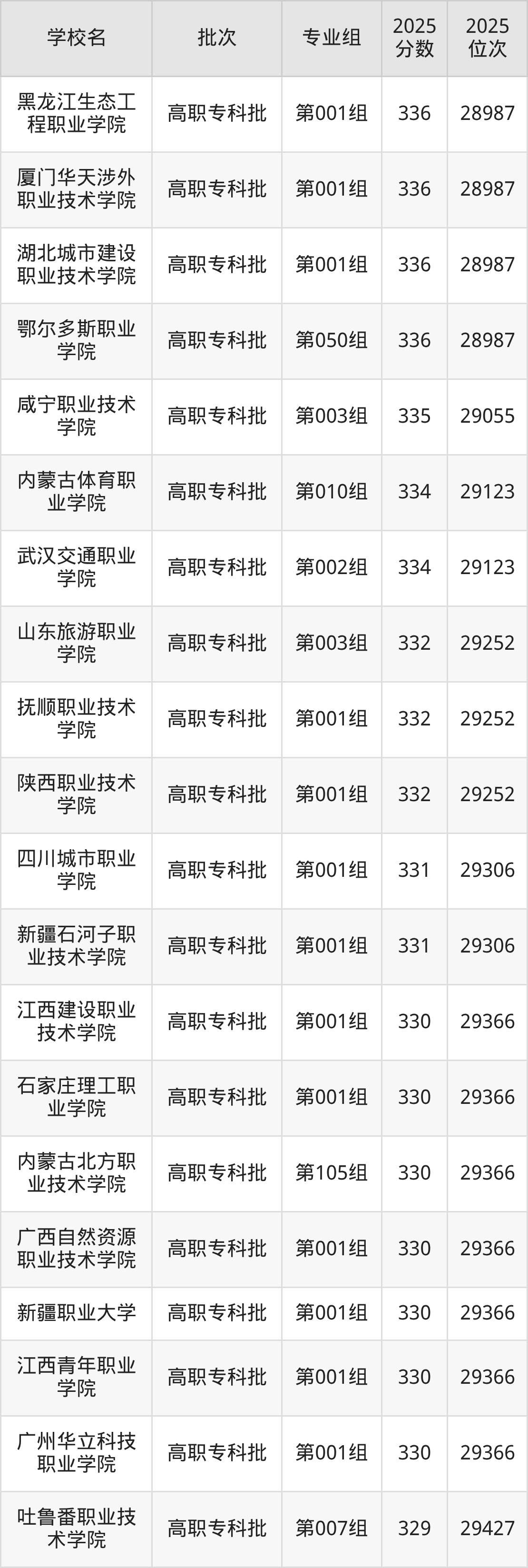 2025年内蒙古高考历史类333分(29124名~29183名)录取位次低于该区间(较稳妥)的有山东旅游职业学院第003组(29252名)、陕西职业技术学院第001组(29252名)等;录取位次高于该区间(可冲)的有内蒙古体育职业学院第010组(29123名)、武汉交通职业学院第002组(29123名)等。