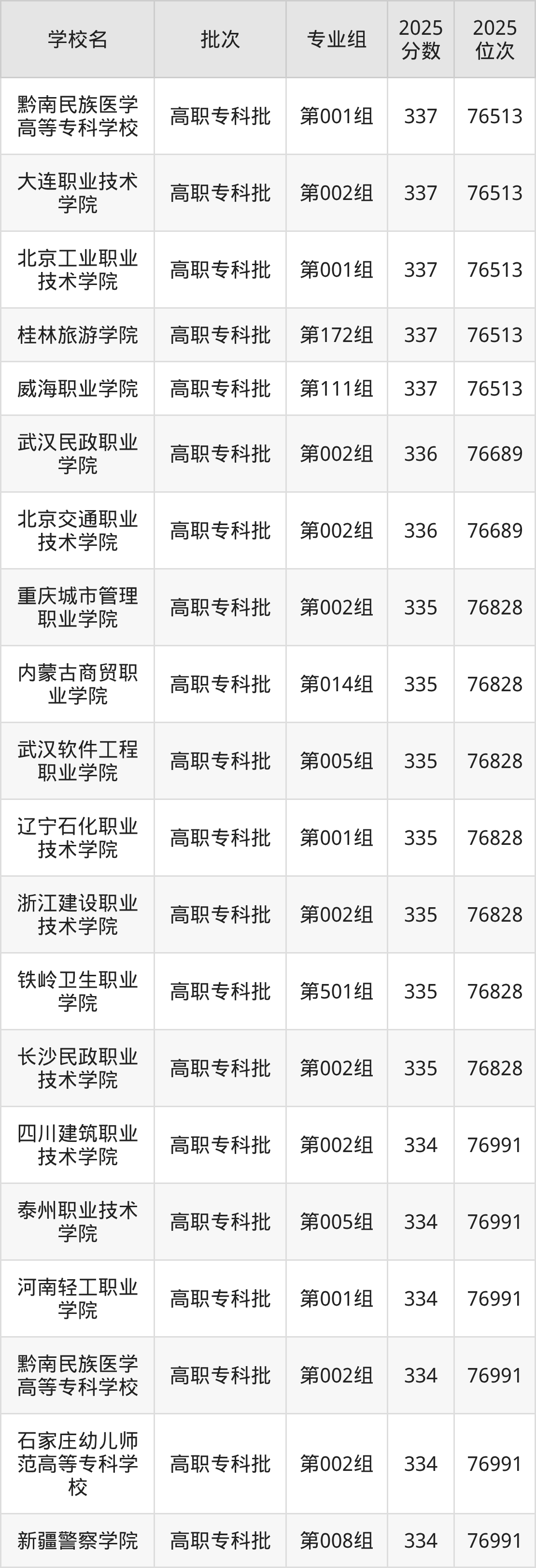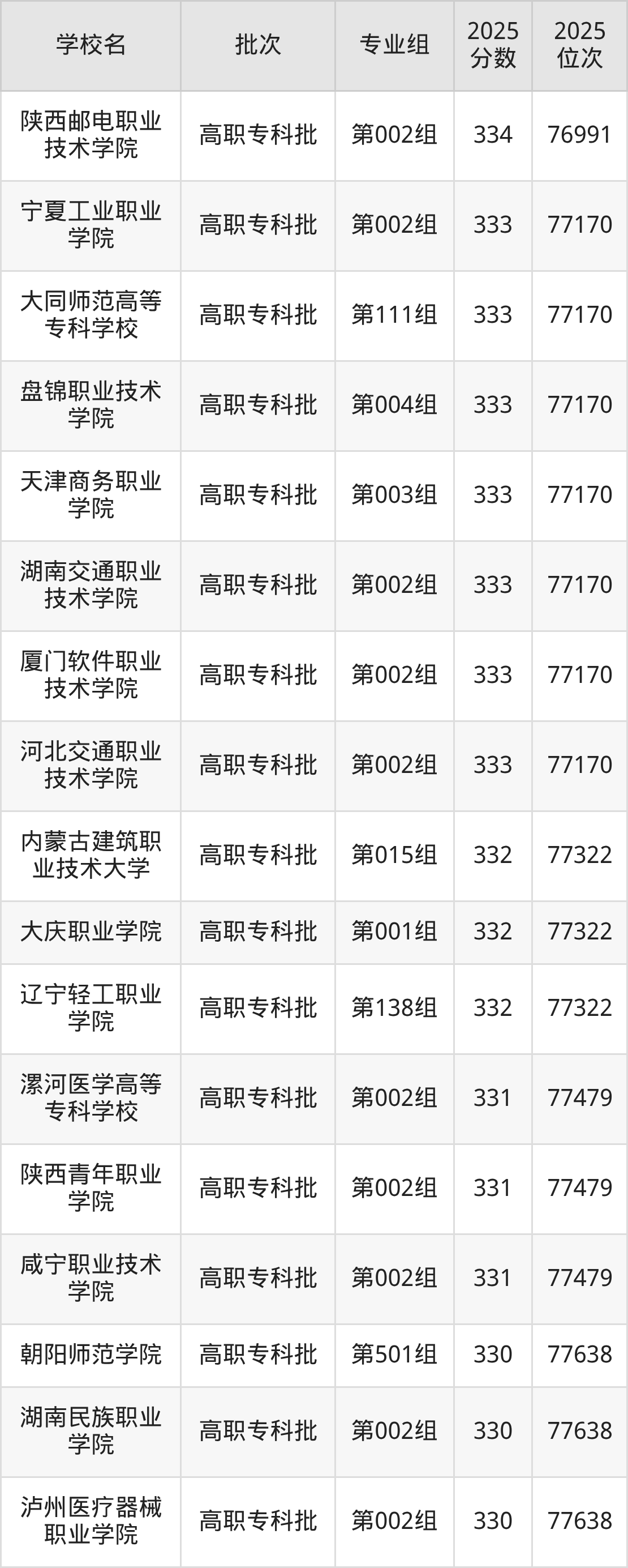 2025年内蒙古高考物理类333分(76992名~77170名)能上的大学有大同师范高等专科学校第111组、河北交通职业技术学院第002组、天津商务职业学院第003组、盘锦职业技术学院第004组等。
