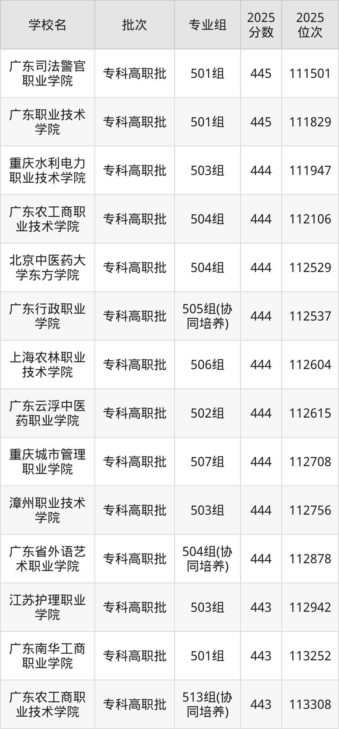 2025年广东高考历史类444分(111886名~112888名)能上的大学有漳州职业技术学院503组、广东农工商职业技术学院504组、广东行政职业学院505组(协同培养)、重庆城市管理职业学院507组等。