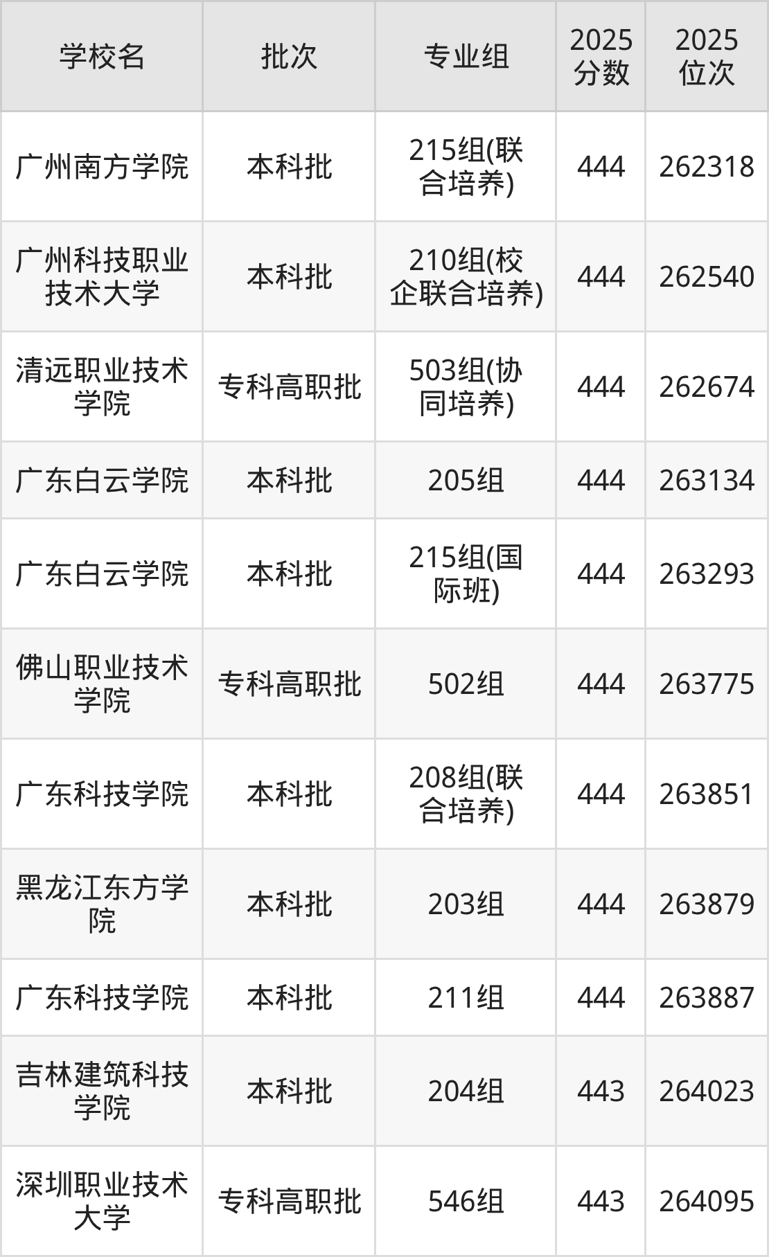 2025年广东高考物理类444分(262284名~263920名)能上的大学有广东白云学院205组、广东白云学院215组(国际班)、黑龙江东方学院203组、广州南方学院215组(联合培养)等。