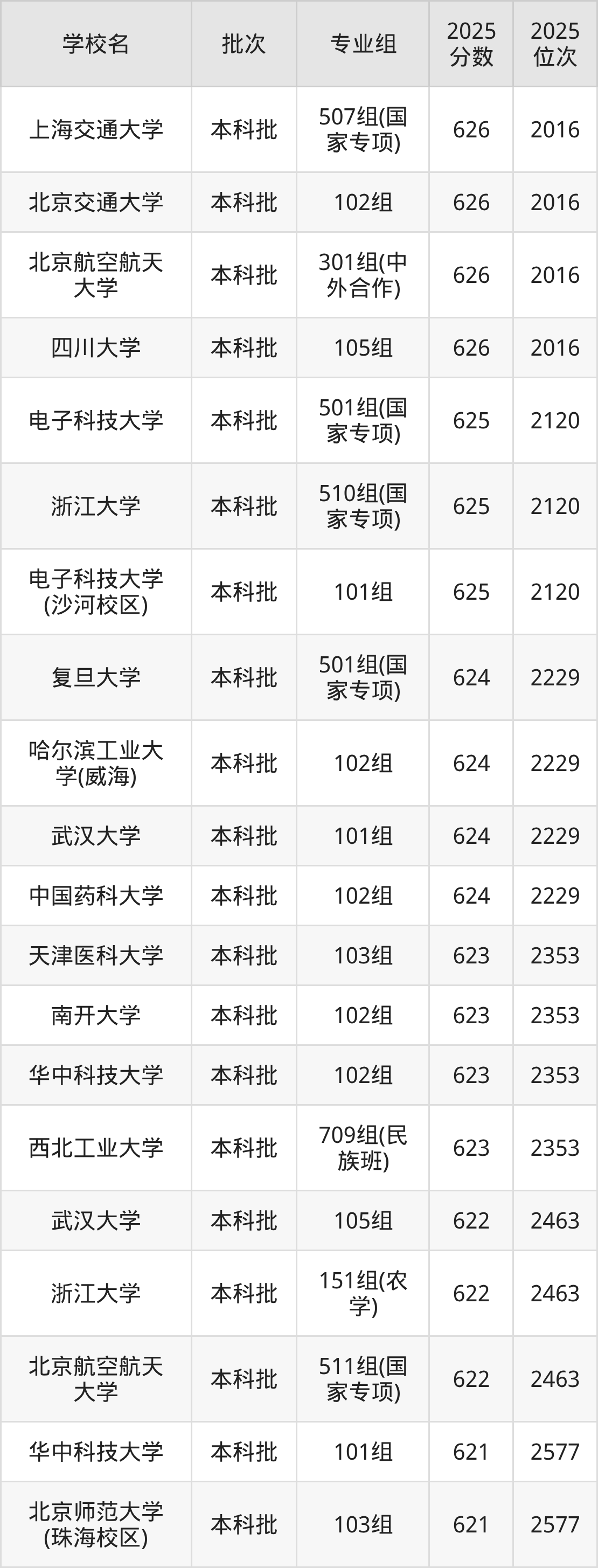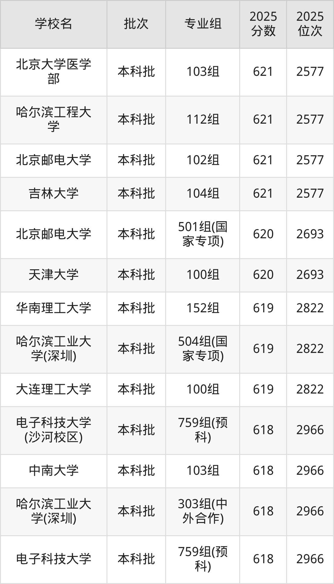 2025年广西高考物理类621分(2464名~2577名)能上的大学有北京邮电大学102组、吉林大学104组、哈尔滨工程大学112组、华中科技大学101组等。