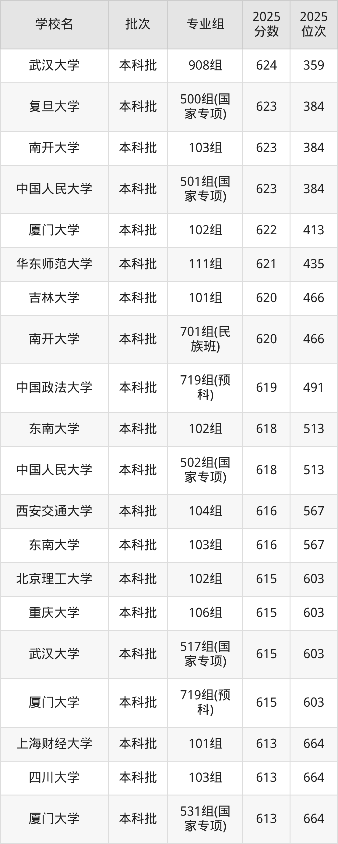 另外录取位次低于该区间(较稳妥)的有南开大学701组(民族班)(466名)、吉林大学101组(466名)等;录取位次高于该区间(可冲)的有厦门大学102组(413名)、中国人民大学501组(国家专项)(384名)等。