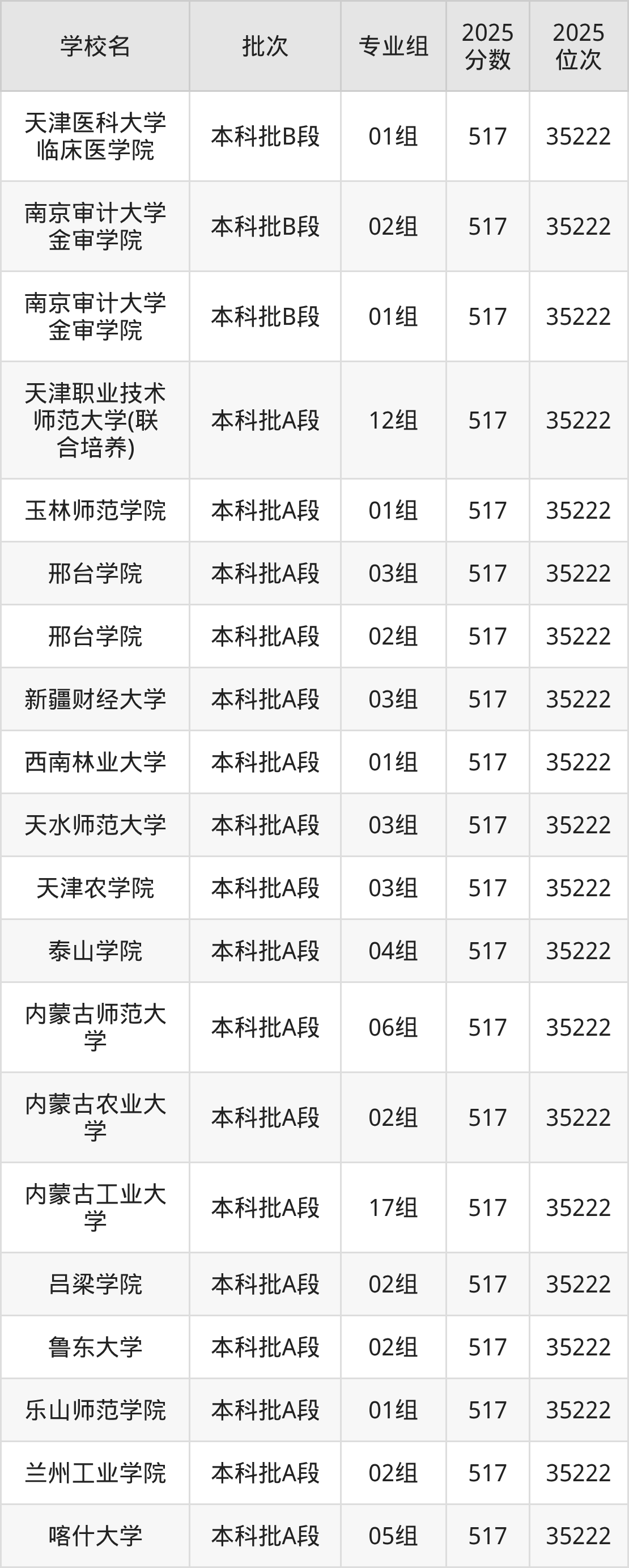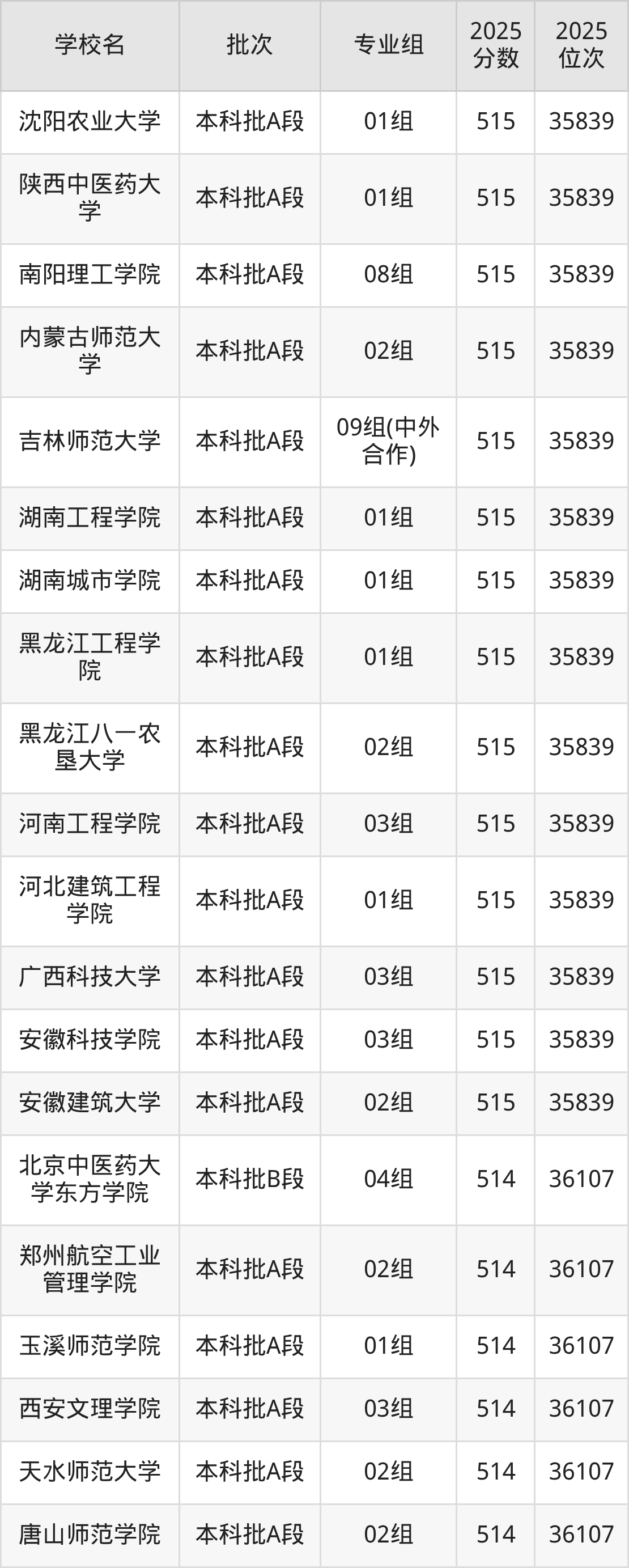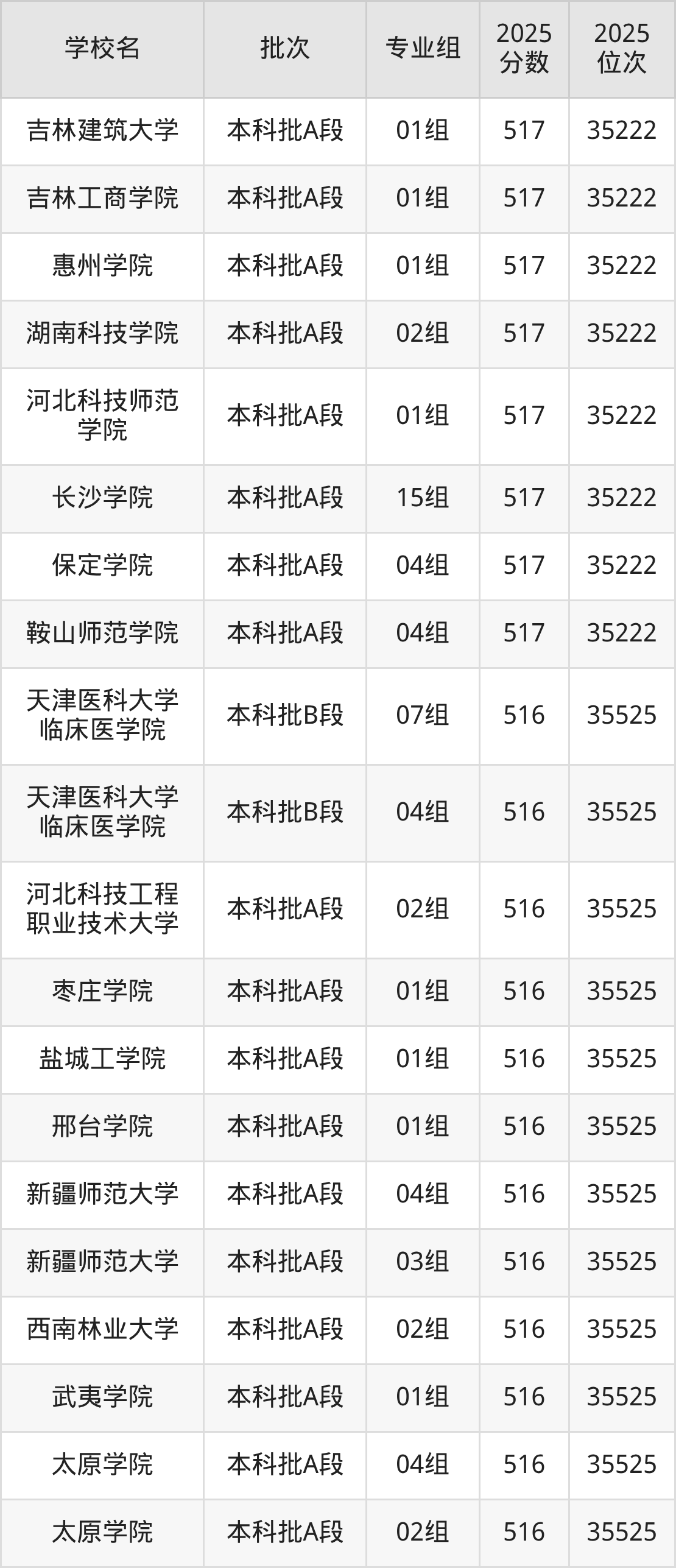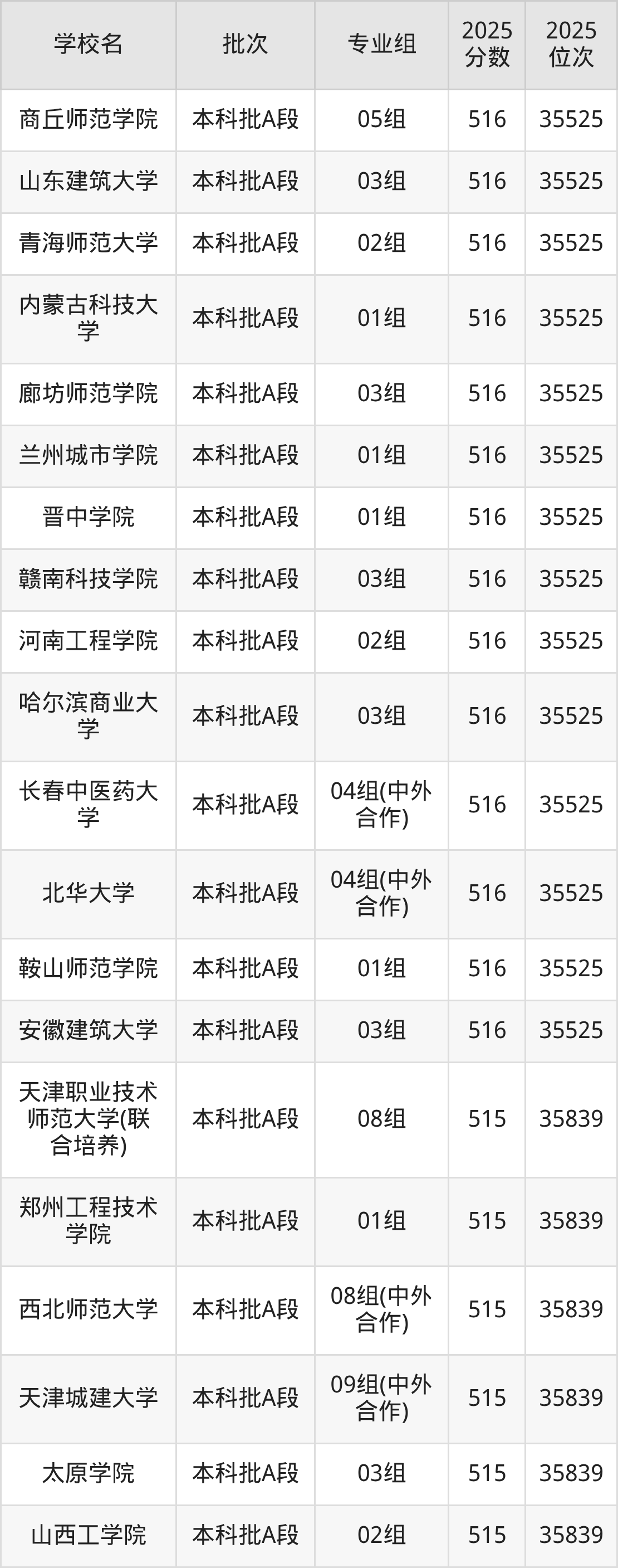 2025年天津高考515分(35526名~35839名)能上的大学有安徽建筑大学02组、安徽科技学院03组、广西科技大学03组、河北建筑工程学院01组等。
