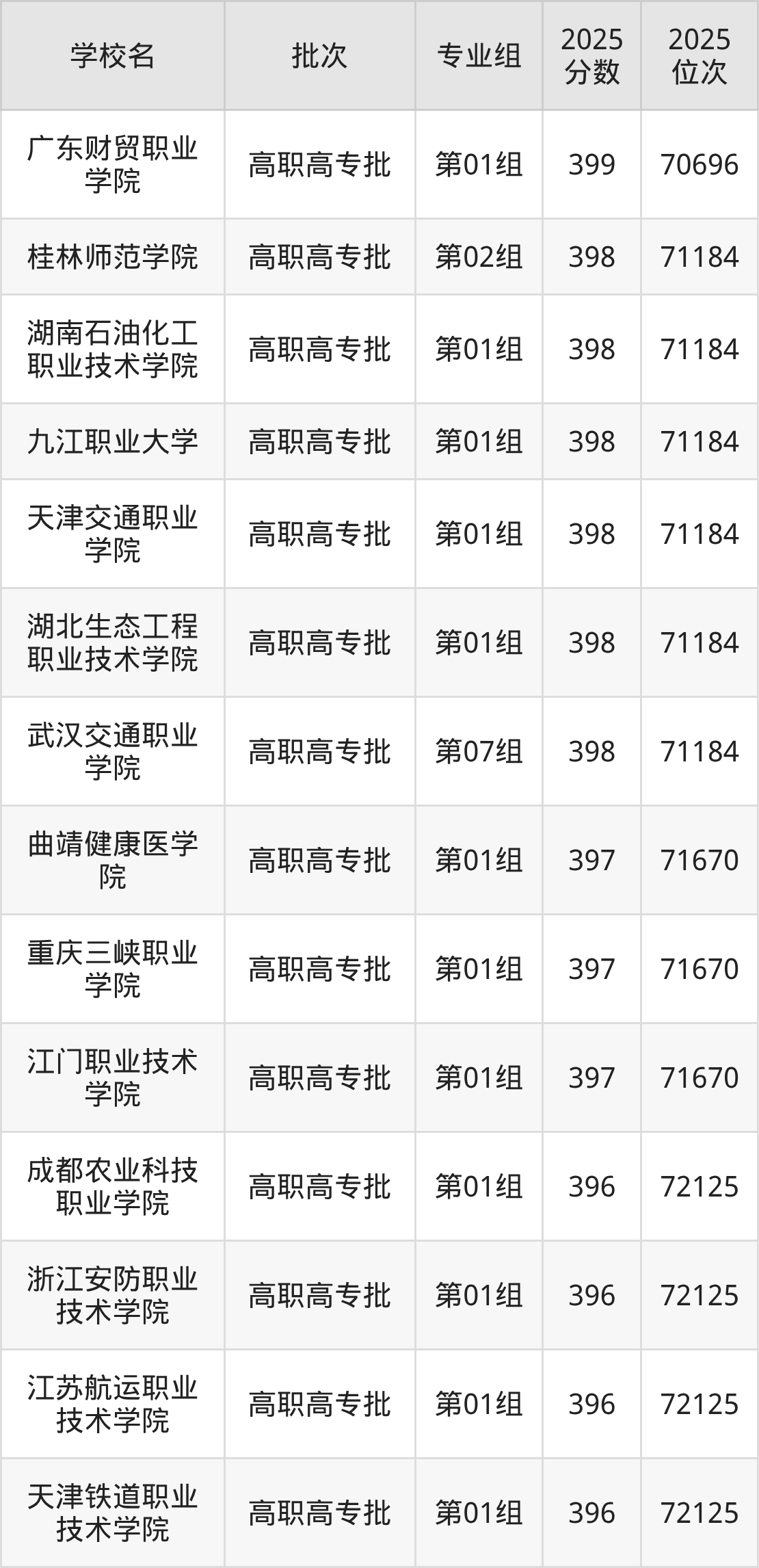 2025年湖北高考历史类397分(71185名~71670名)能上的大学有江门职业技术学院第01组、重庆三峡职业学院第01组、曲靖健康医学院第01组。