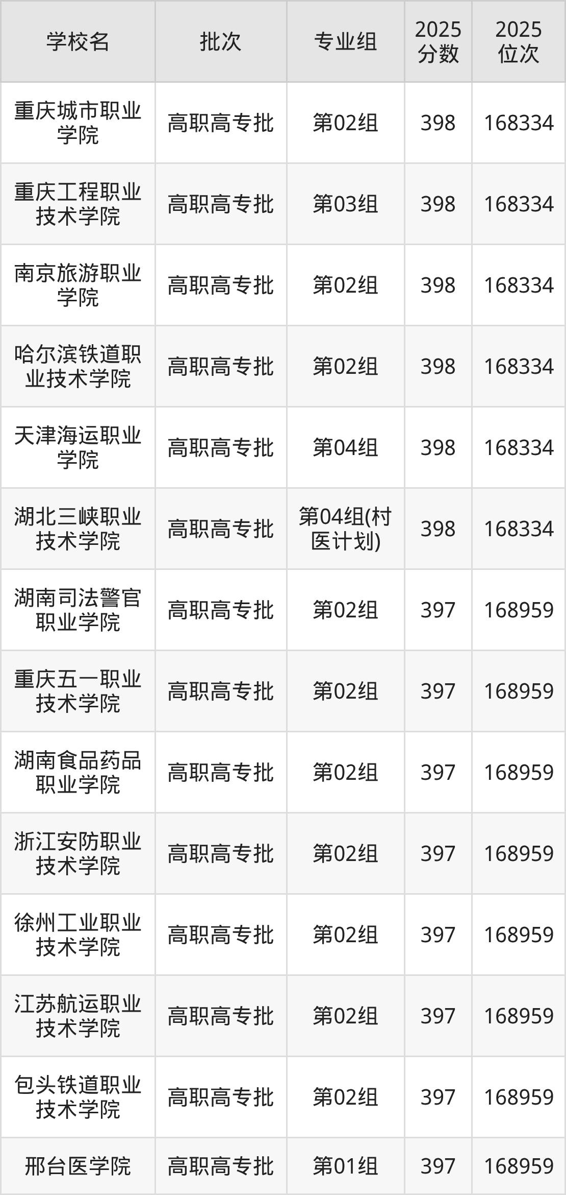 2025年湖北高考物理类397分(168335名~168959名)能上的大学有邢台医学院第01组、包头铁道职业技术学院第02组、江苏航运职业技术学院第02组、徐州工业职业技术学院第02组等。
