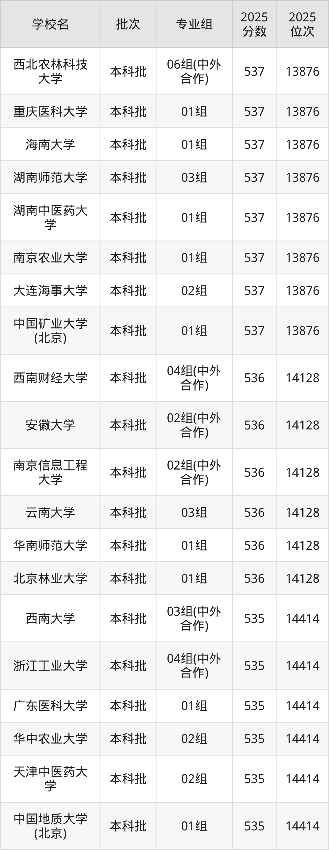 这些都是2026年高考14129名~14414名考生可以报考的大学,更多学校名单如下表所示: