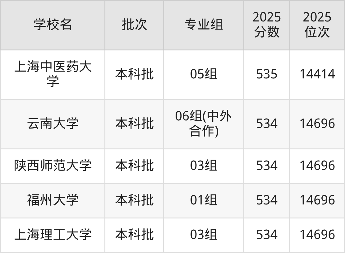 2025年上海高考535分(14129名~14414名)能上的大学有上海中医药大学05组、中国地质大学(北京)01组、天津中医药大学02组、华中农业大学02组等。