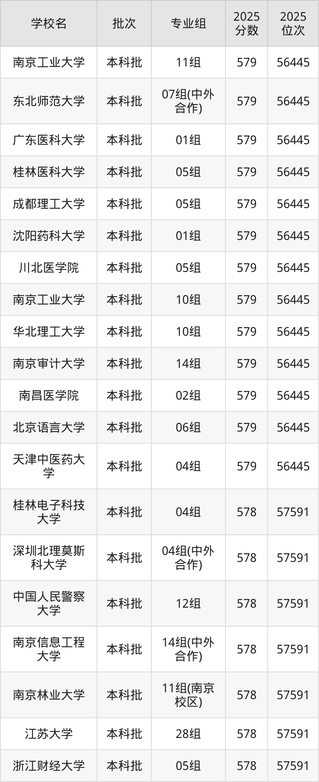2025年江苏高考物理类578分(56446名~57591名)能上的大学有中国人民警察大学12组、南京信息工程大学14组(中外合作)、南京林业大学11组(南京校区)、江苏大学28组等。