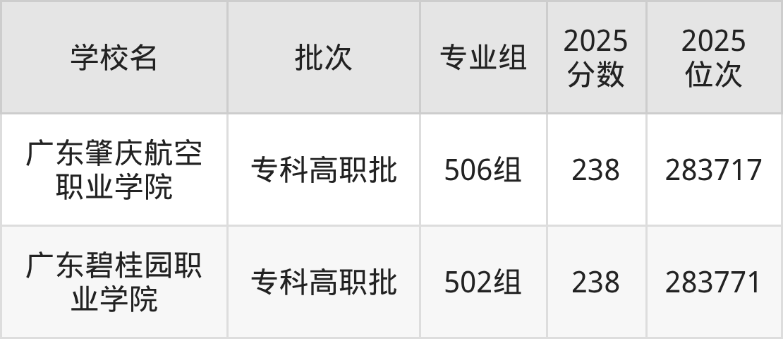 2025年广东高考历史类236分(283999名~284216名)录取位次低于该区间(较稳妥)的有广东碧桂园职业学院503组(285736名)、哈尔滨商贸职业学院503组(286154名)等;录取位次高于该区间(可冲)的有广东碧桂园职业学院502组(283771名)、广东肇庆航空职业学院506组(283717名)等。
