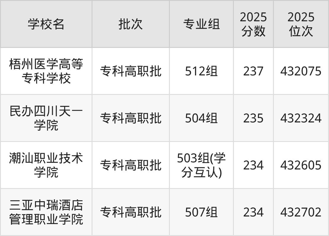 2025年广东高考物理类236分(432112名~432316名)录取位次低于该区间(较稳妥)的有民办四川天一学院504组(432324名)、潮汕职业技术学院503组(学分互认)(432605名)等;录取位次高于该区间(可冲)的有梧州医学高等专科学校512组(432075名)、长沙医药健康职业学院502组(431222名)等。