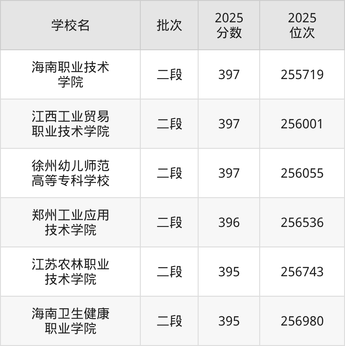 另外录取位次低于该区间(较稳妥)的有江苏农林职业技术学院(256743名)、海南卫生健康职业学院(256980名)等;录取位次高于该区间(可冲)的有徐州幼儿师范高等专科学校(256055名)、江西工业贸易职业技术学院(256001名)等。