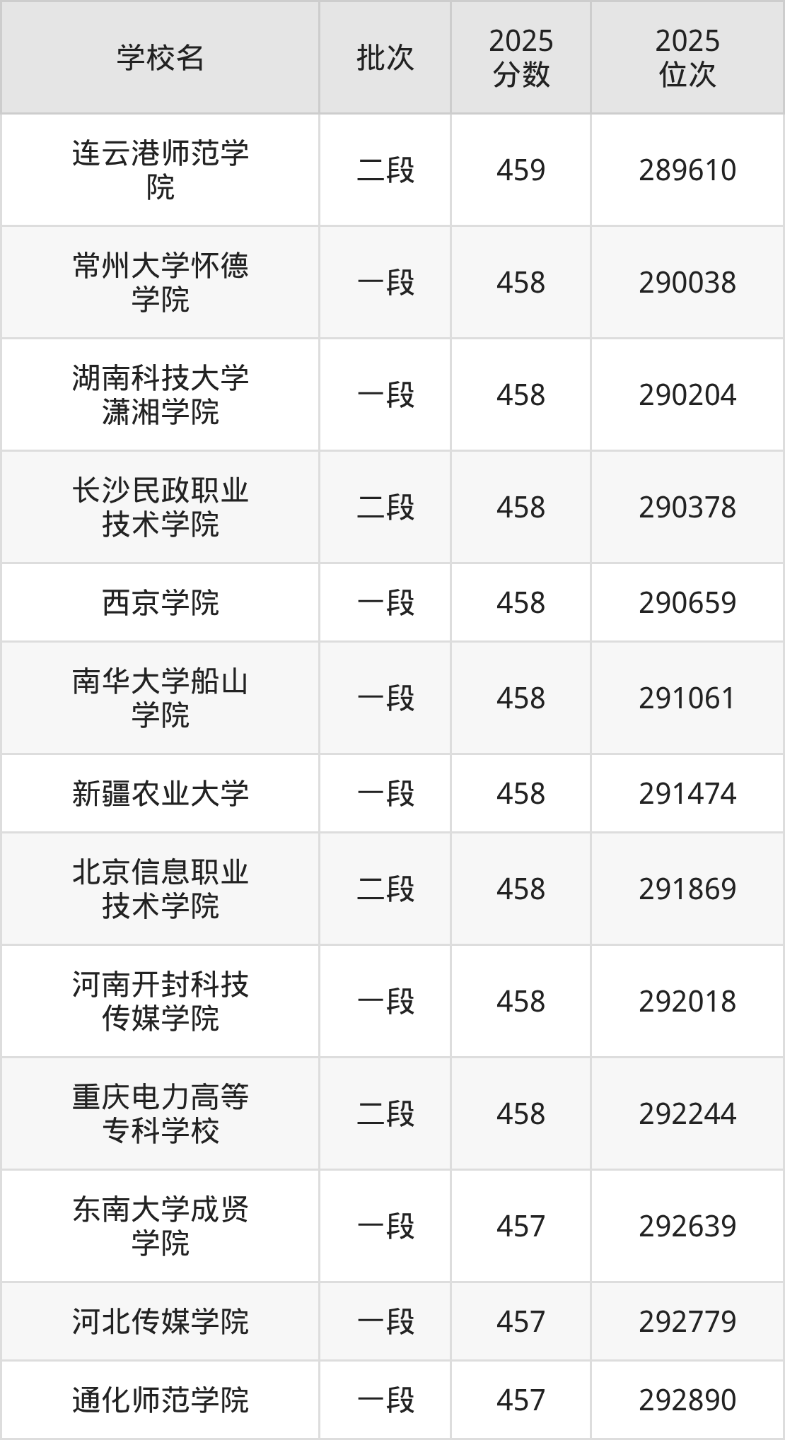 这些都是2026年高考289885名~292391名考生可以报考的大学,更多学校名单如下表所示:
