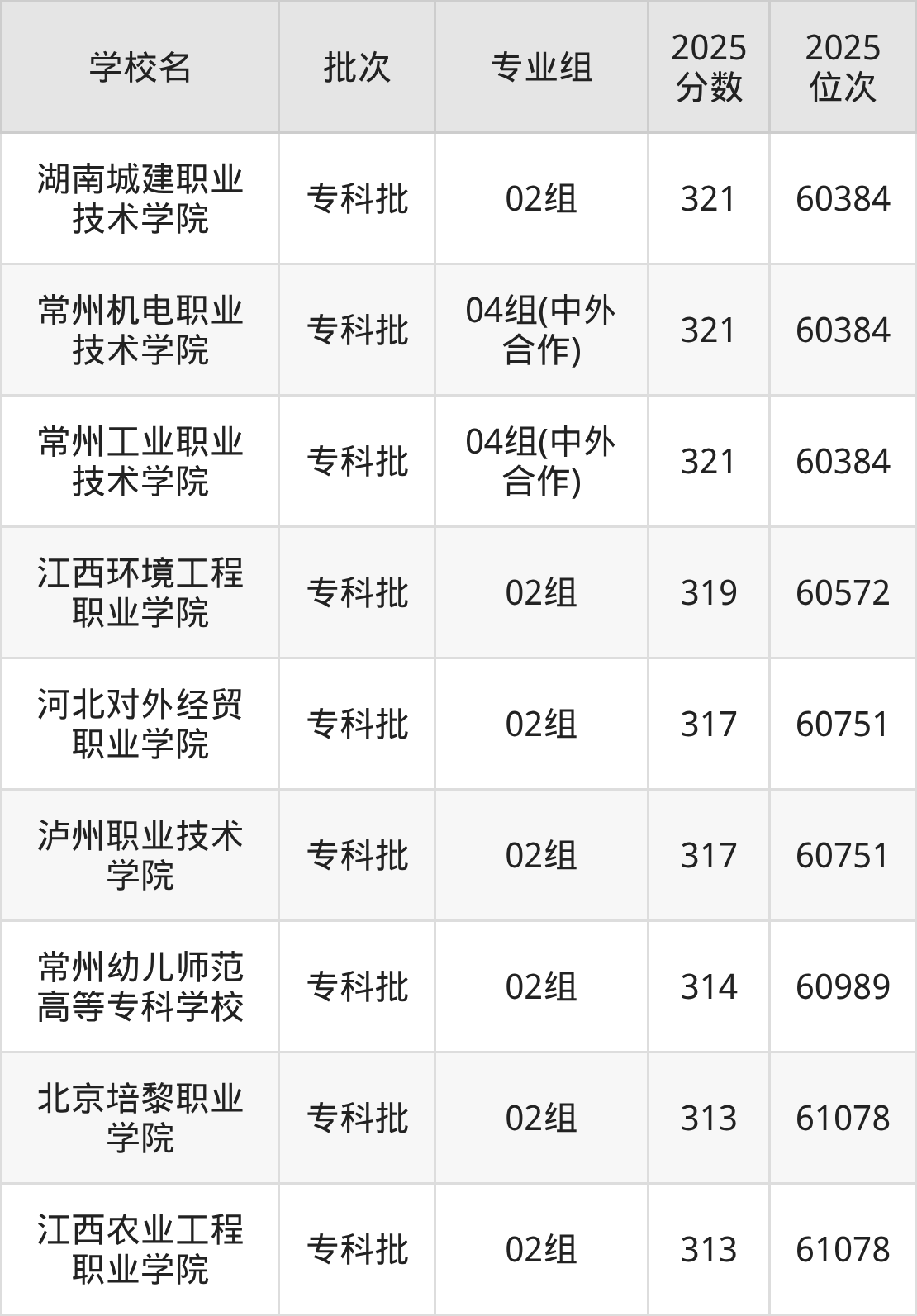 2025年江苏高考物理类316分(60752名~60823名)录取位次低于该区间(较稳妥)的有常州幼儿师范高等专科学校02组(60989名)、江西农业工程职业学院02组(61078名)等;录取位次高于该区间(可冲)的有河北对外经贸职业学院02组(60751名)、泸州职业技术学院02组(60751名)等。