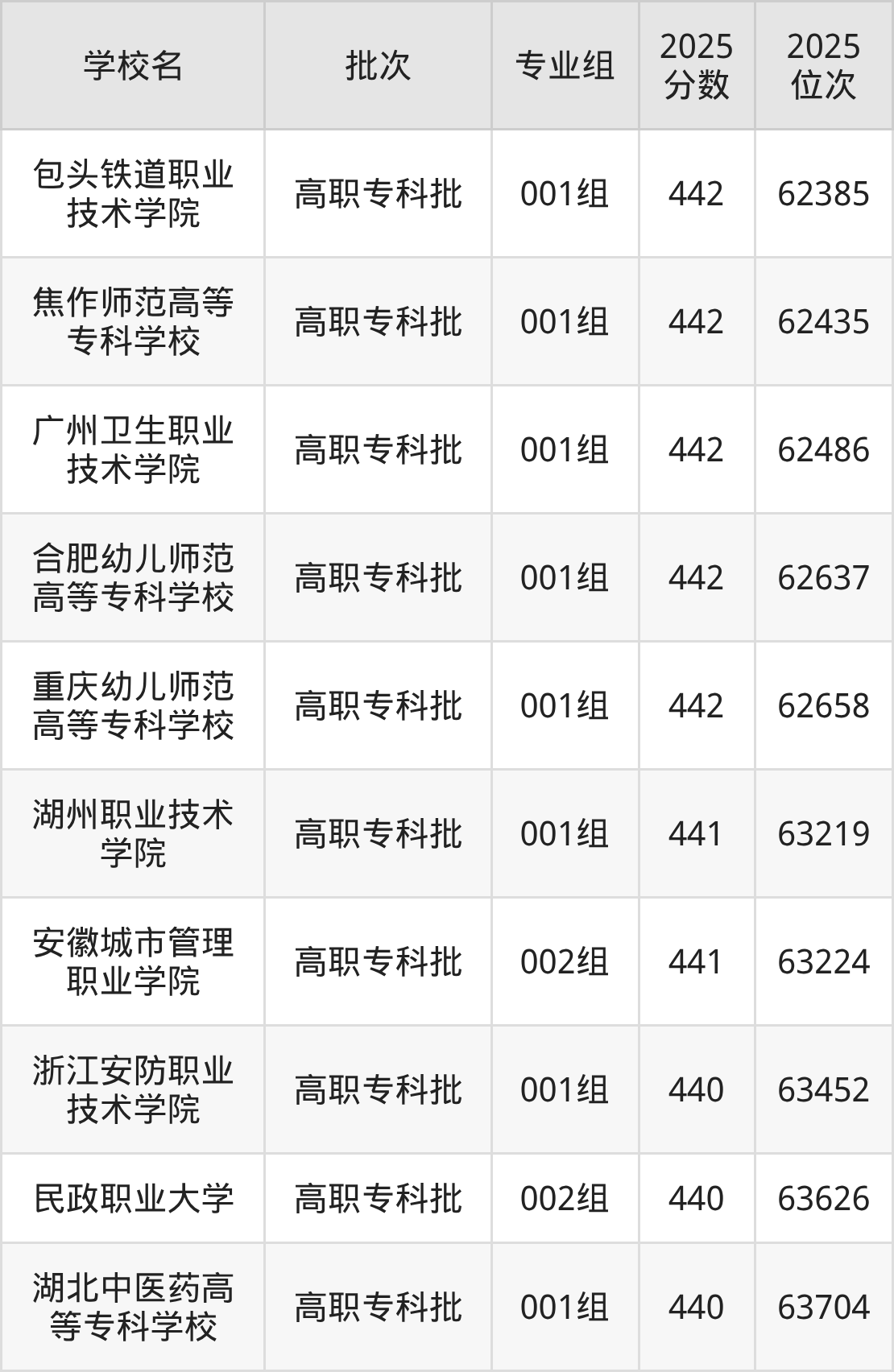 2025年安徽高考历史类441分(62798名~63279名)能上的大学有湖州职业技术学院001组、安徽城市管理职业学院002组。