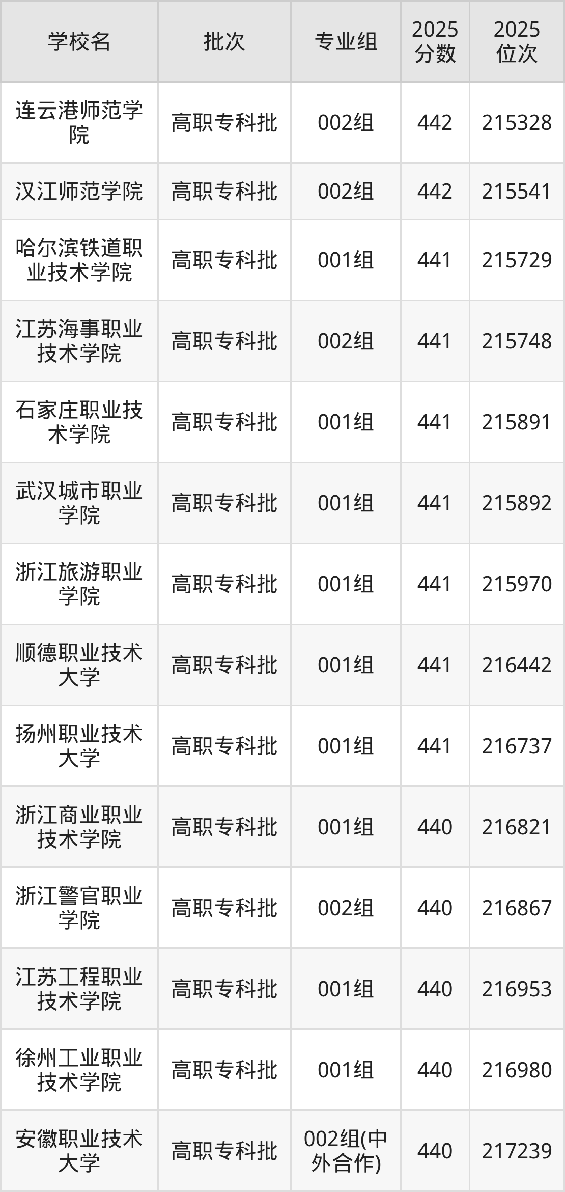 2025年安徽高考物理类441分(215587名~216809名)能上的大学有哈尔滨铁道职业技术学院001组、江苏海事职业技术学院002组、石家庄职业技术学院001组、顺德职业技术大学001组等。