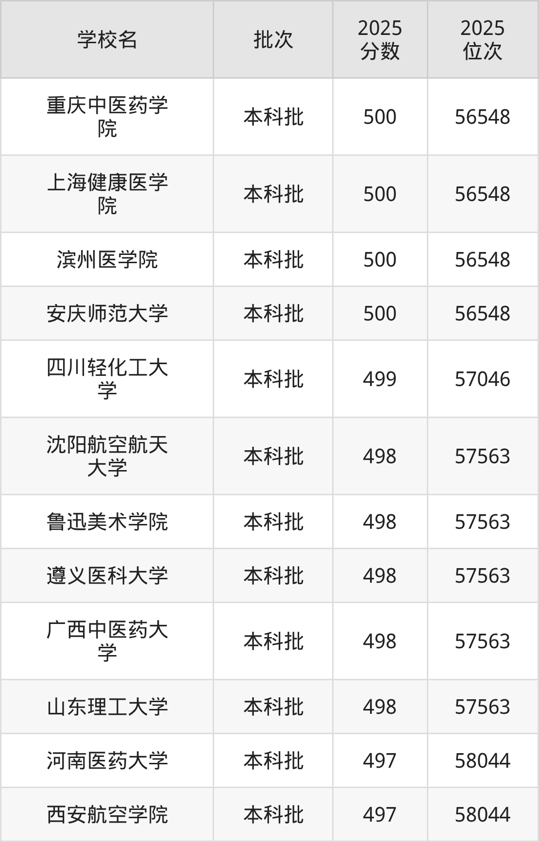 另外录取位次低于该区间(较稳妥)的有西安航空学院(58044名)、河南医药大学(58044名)等;录取位次高于该区间(可冲)的有四川轻化工大学(57046名)、滨州医学院(56548名)等。