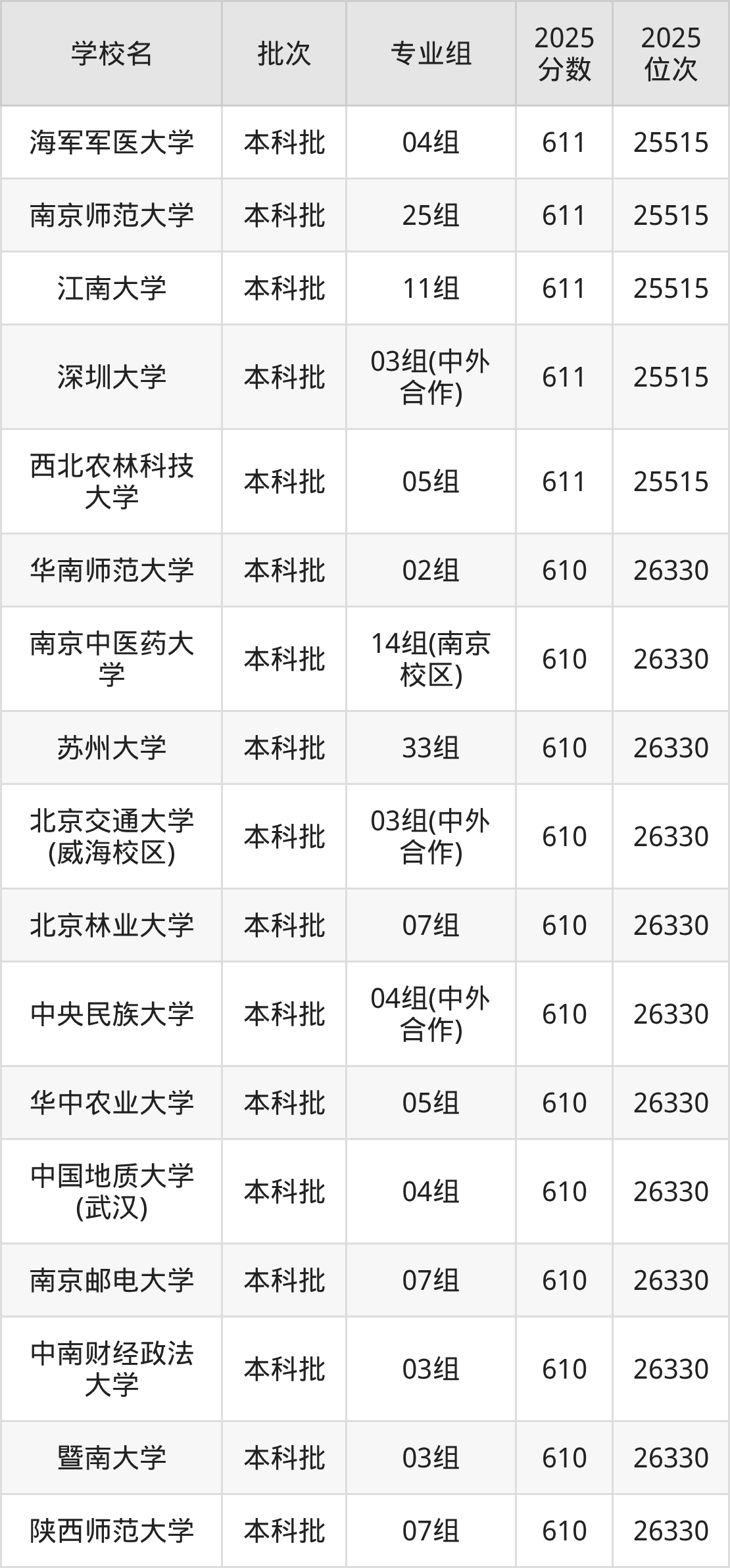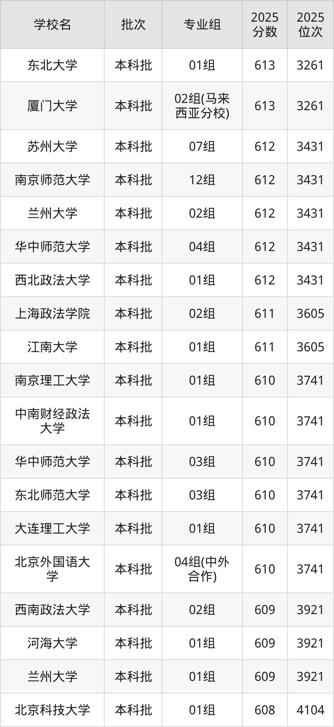 2025年江苏高考历史类610分(3606名~3741名)能上的大学有南京理工大学01组、北京外国语大学04组(中外合作)、大连理工大学01组、东北师范大学03组等。