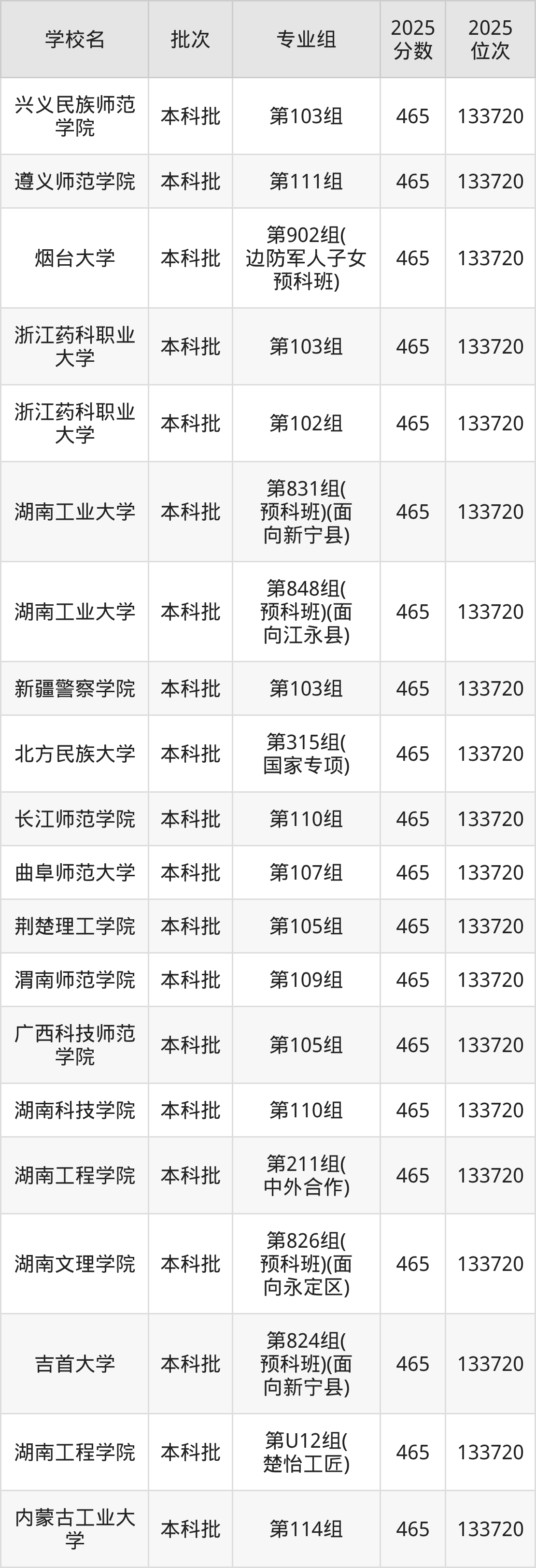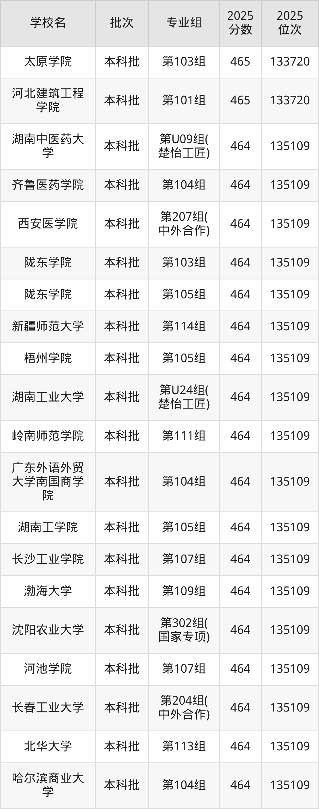 2025年湖南高考物理类464分(133721名~135109名)能上的大学有防灾科技学院第104组、沈阳农业大学第302组(国家专项)、渤海大学第109组、长春工业大学第204组(中外合作)等。