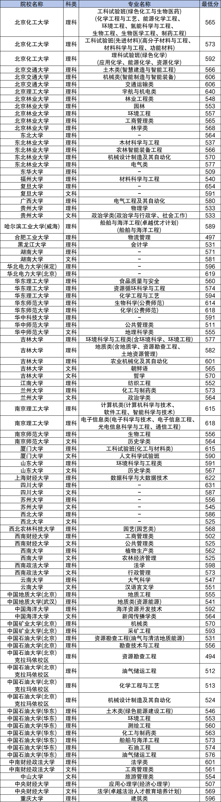 2024年内蒙古高校专项计划录取分数线范围是494分到654分,各个大学最低分不同,如:中国石油大学(华东)546分;吉林大学文科565分、理科577分;北京林业大学548分;南京理工大学615分。完整分数线一览表如下。