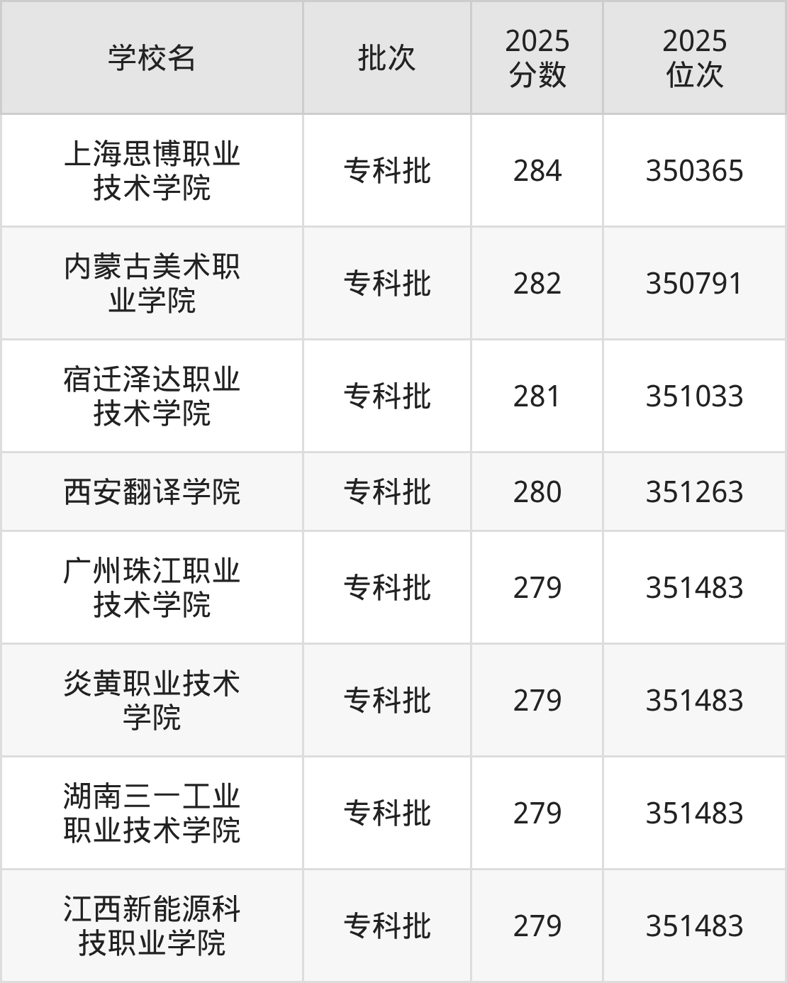 另外录取位次低于该区间(较稳妥)的有西安翻译学院(351263名)、广州珠江职业技术学院(351483名)等;录取位次高于该区间(可冲)的有内蒙古美术职业学院(350791名)、上海思博职业技术学院(350365名)等。