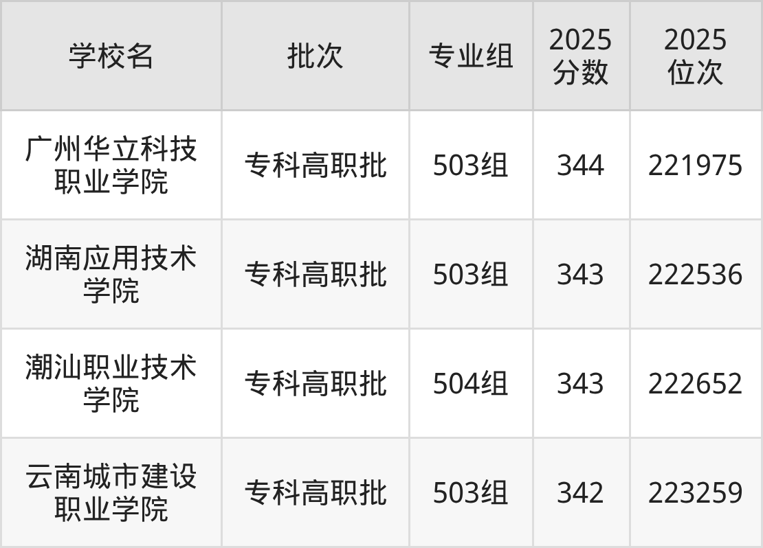 2025年广东高考历史类343分(222056名~223047名)能上的大学有潮汕职业技术学院504组、湖南应用技术学院503组。