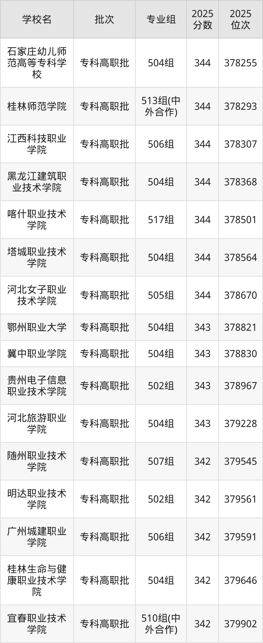 2025年广东高考物理类343分(378696名~379416名)能上的大学有鄂州职业大学504组、贵州电子信息职业技术学院502组、河北旅游职业学院504组、冀中职业学院504组。