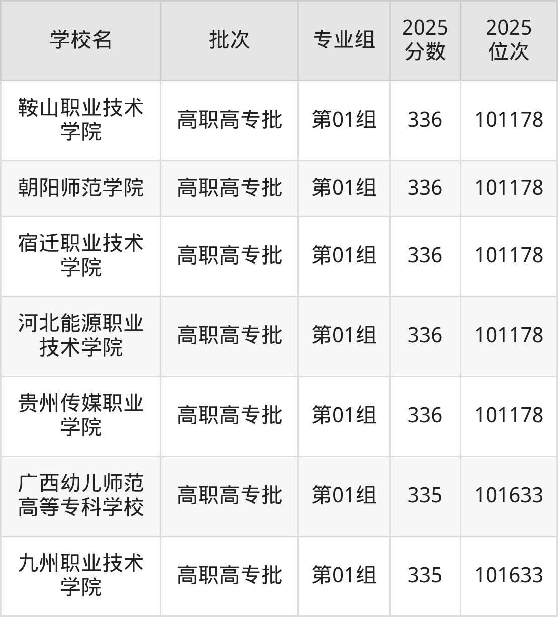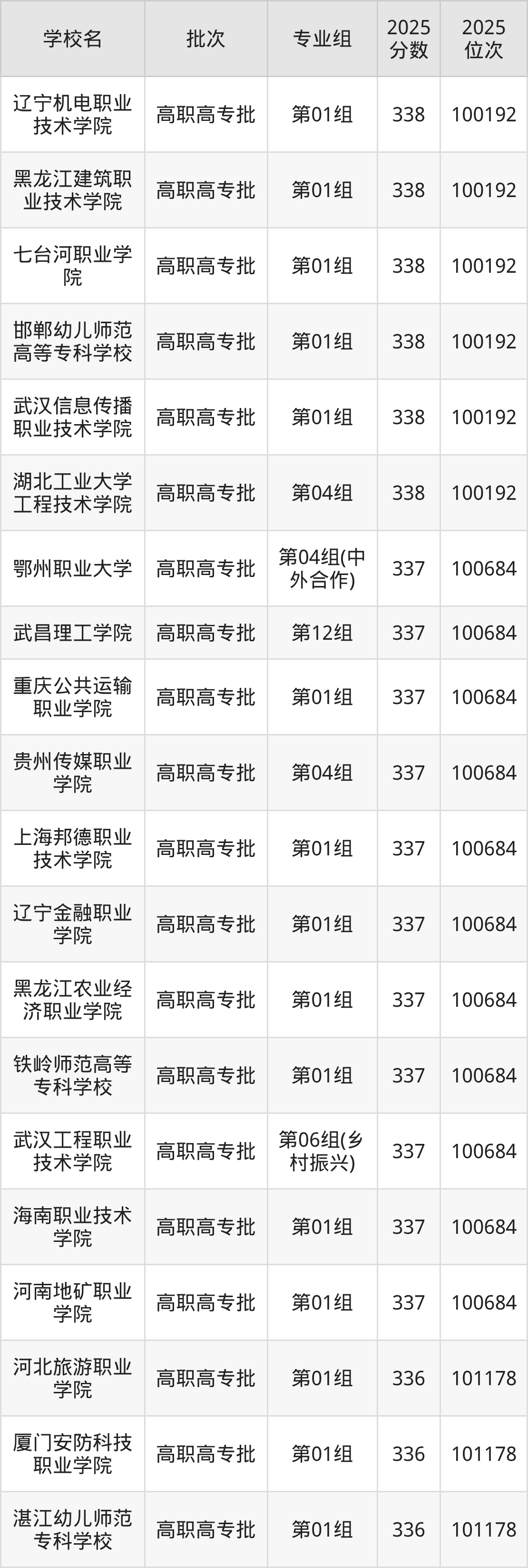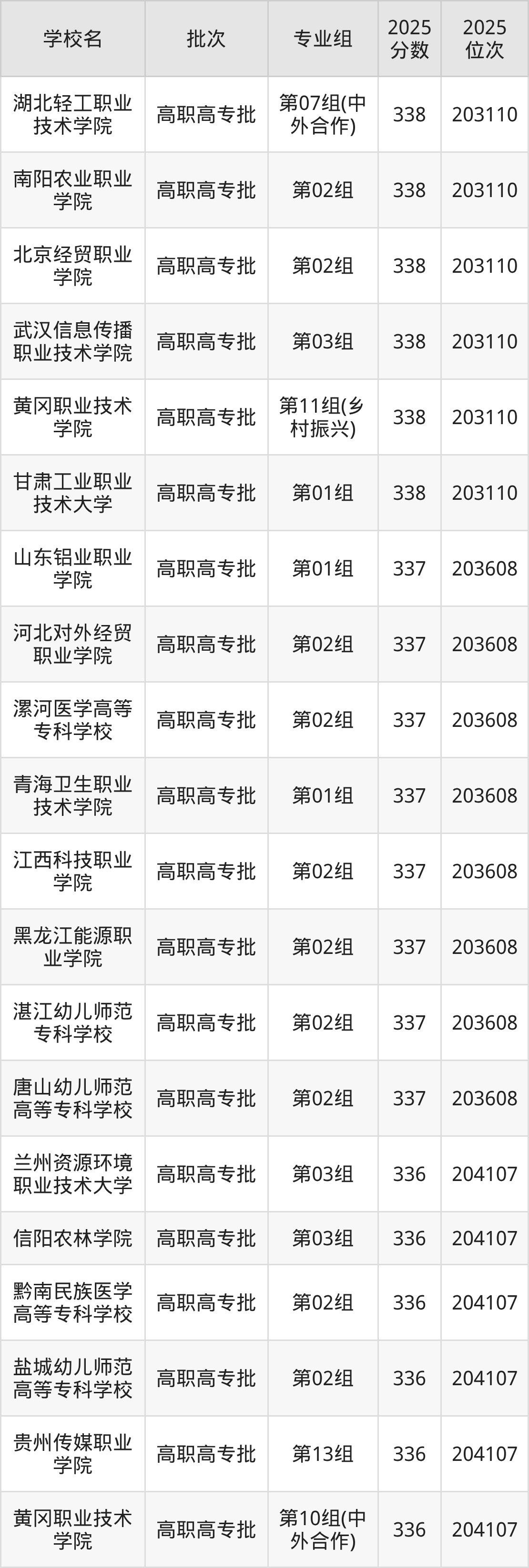 2025年湖北高考物理类336分(203609名~204107名)能上的大学有黄冈职业技术学院第10组(中外合作)、信阳农林学院第03组、兰州资源环境职业技术大学第03组、盐城幼儿师范高等专科学校第02组等。