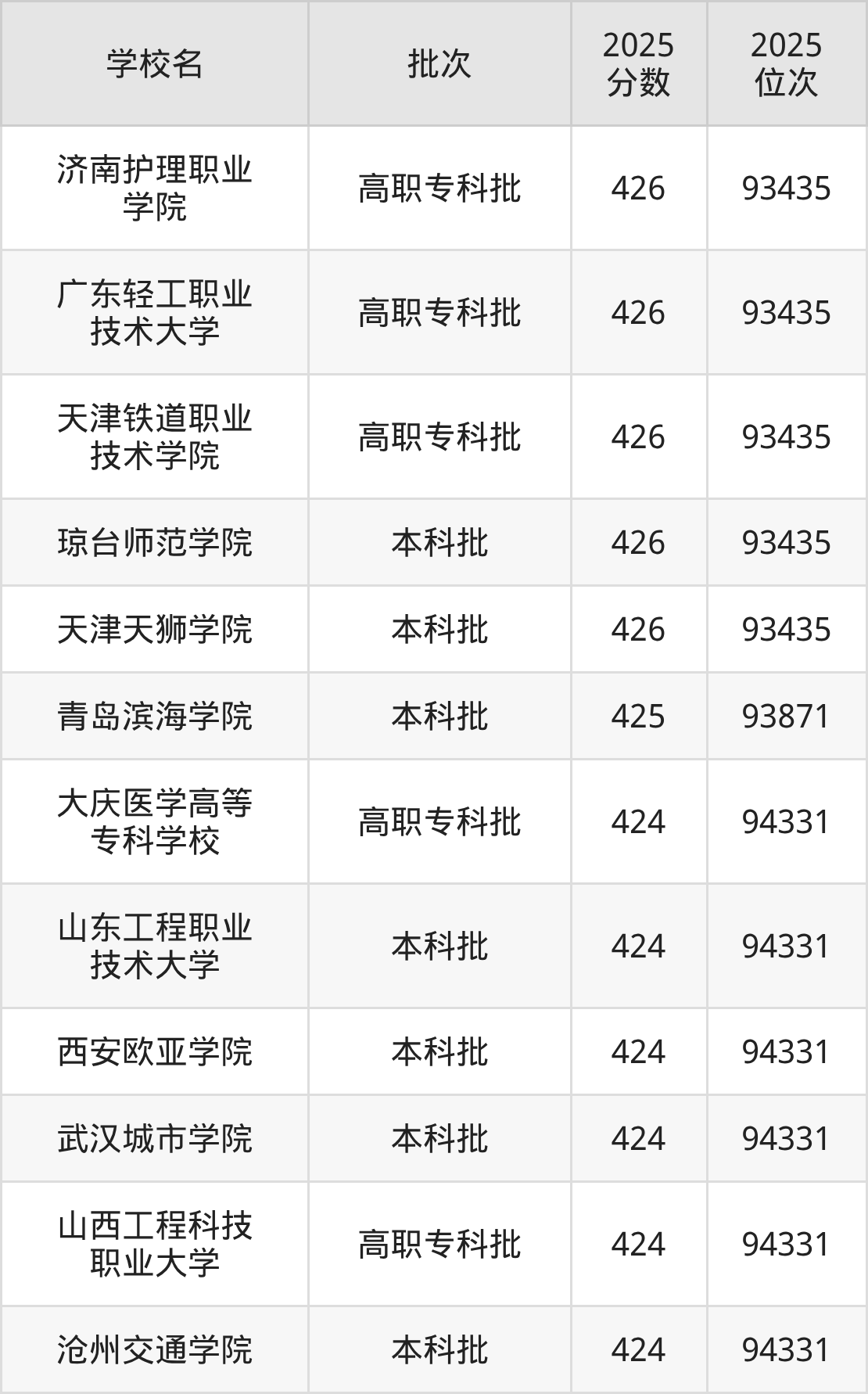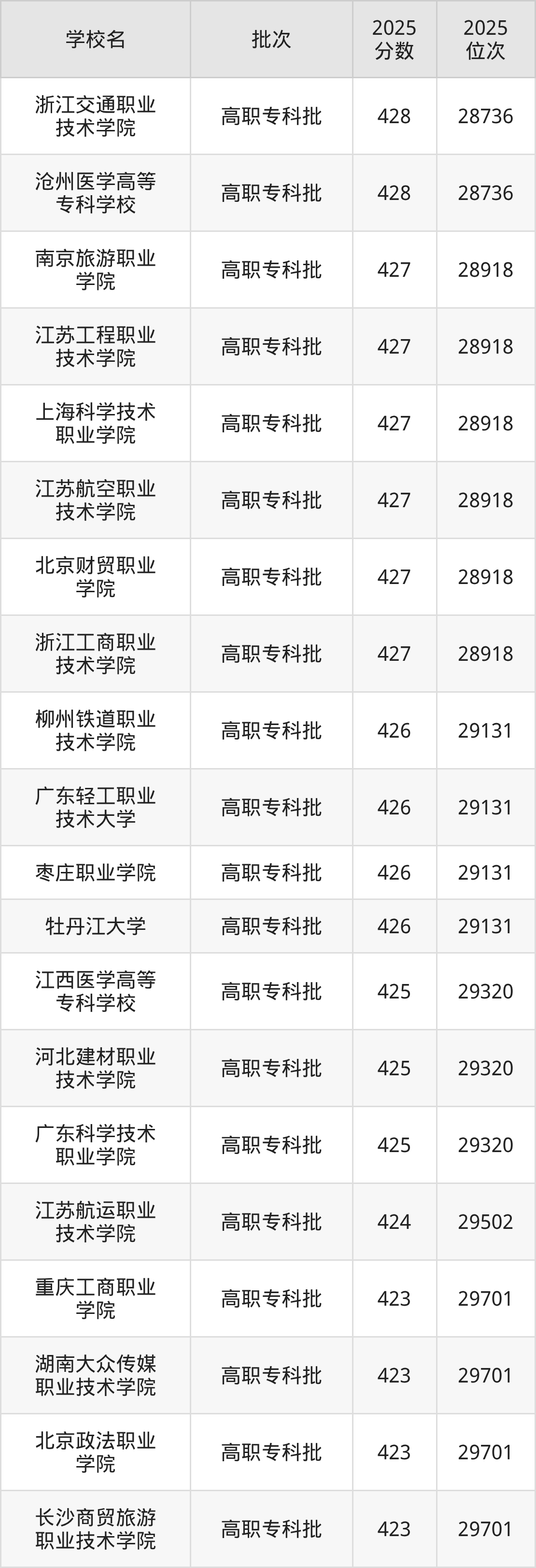 2025年辽宁高考历史类425分(29132名~29320名)能上的大学有广东科学技术职业学院、江西医学高等专科学校、河北建材职业技术学院。