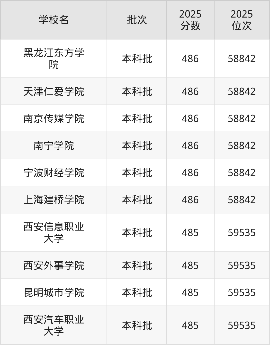 2025年河北高考历史类485分(58843名~59535名)能上的大学有西安外事学院、昆明城市学院、西安信息职业大学、西安汽车职业大学。