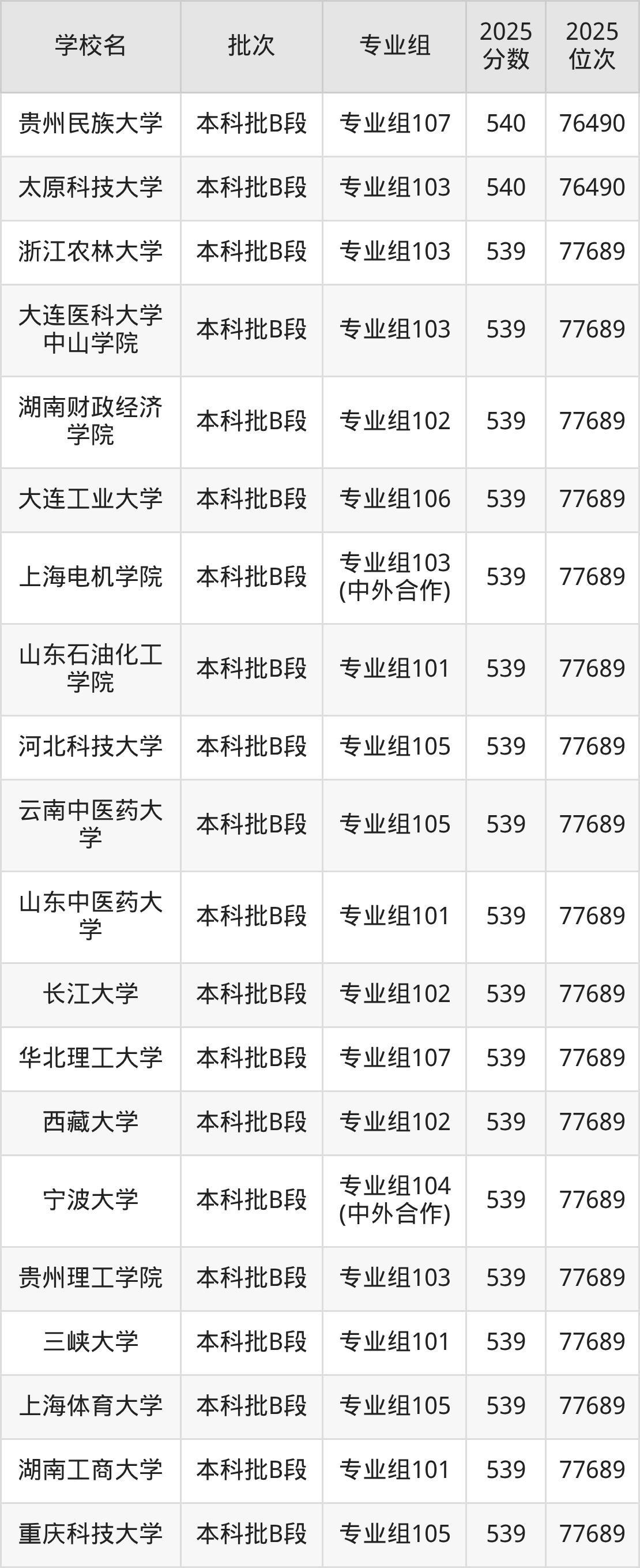 2025年四川高考物理类539分(76491名~77689名)能上的大学有山东中医药大学专业组101、河北科技大学专业组105、长江大学专业组102、湖南财政经济学院专业组102等。
