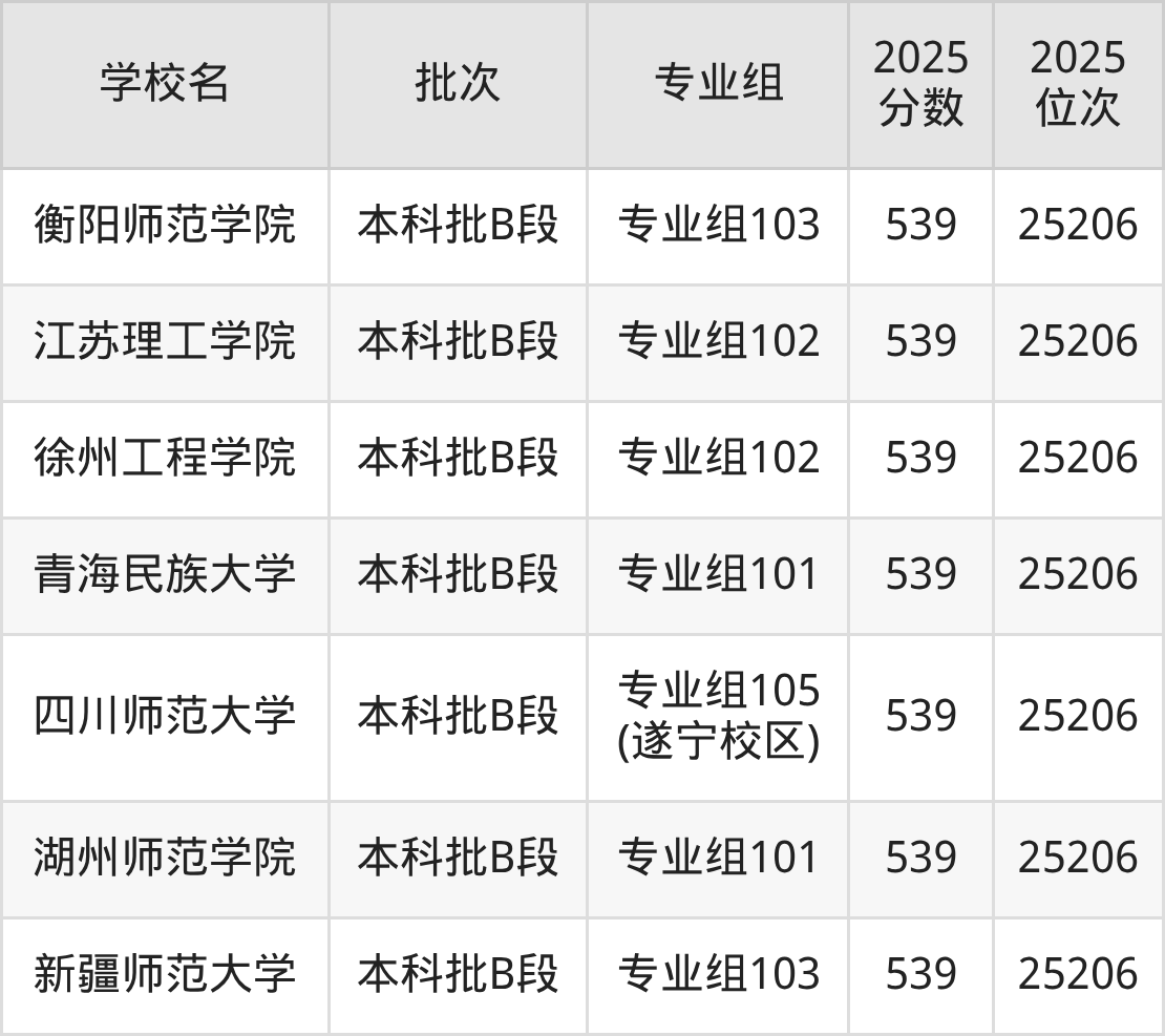 2025年四川高考历史类539分(24732名~25206名)能上的大学有赣南师范大学专业组103、新疆师范大学专业组103、湖州师范学院专业组101、四川师范大学专业组105(遂宁校区)等。