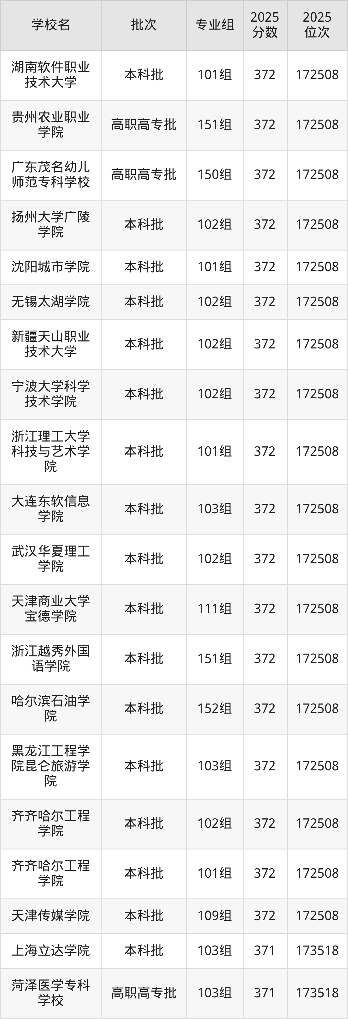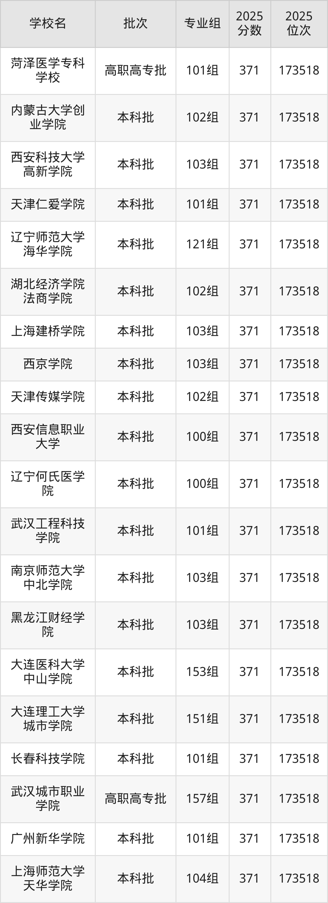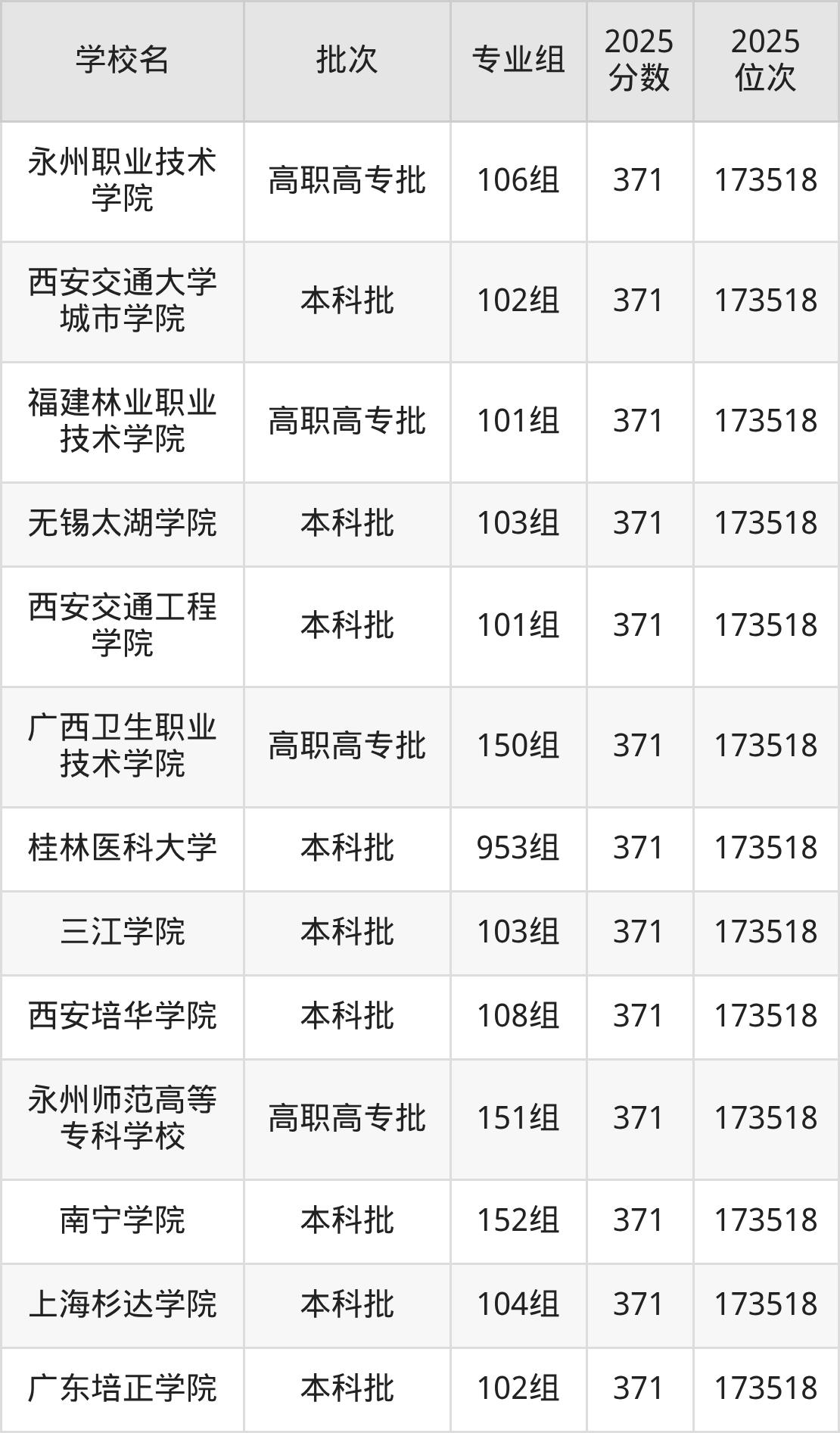 2025年广西高考物理类371分(172509名~173518名)能上的大学有桂林医科大学953组、三江学院103组、西安培华学院108组、南宁学院152组等。