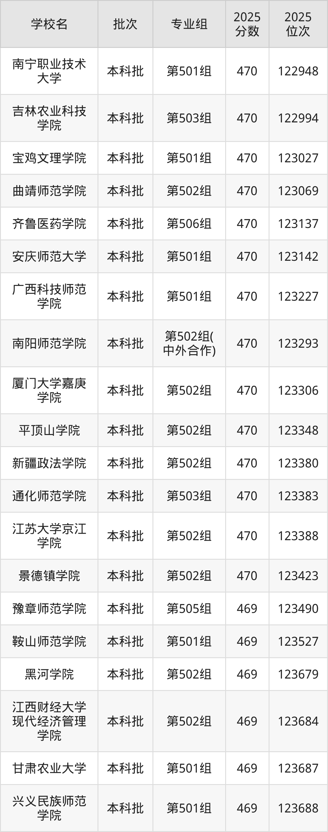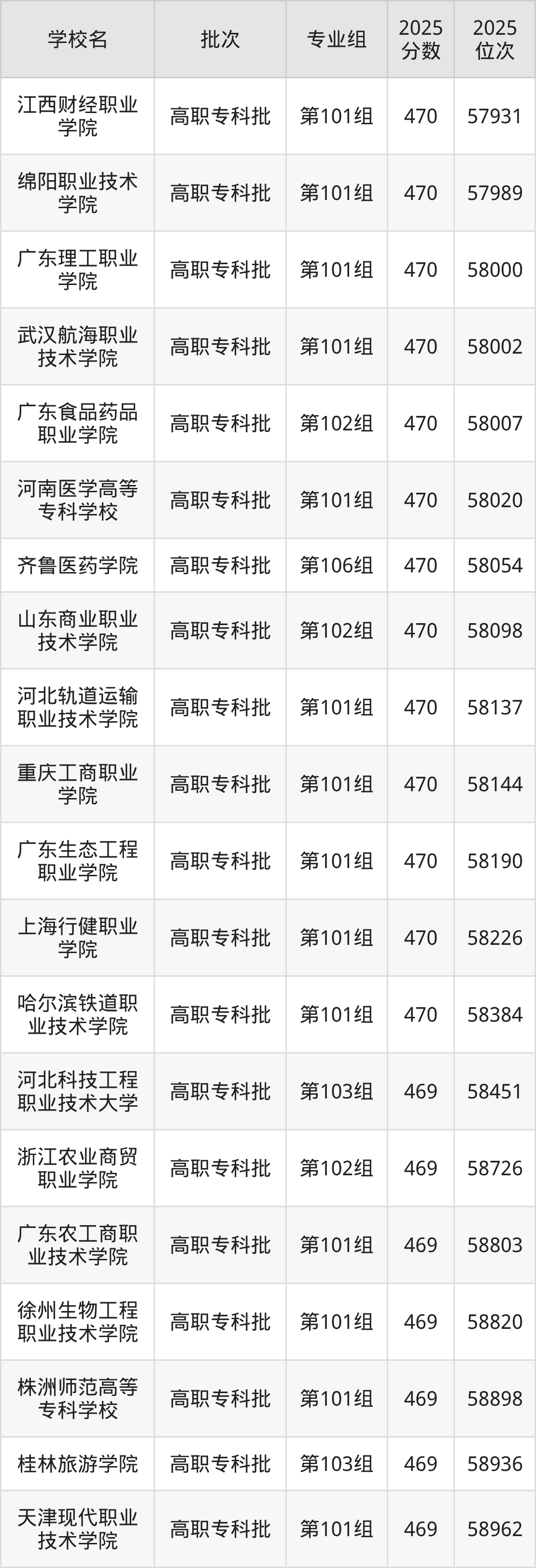 2025年江西高考历史类469分(58427名~59079名)能上的大学有河北科技工程职业技术大学第103组、桂林旅游学院第103组、朝阳师范学院第102组、天津现代职业技术学院第101组等。