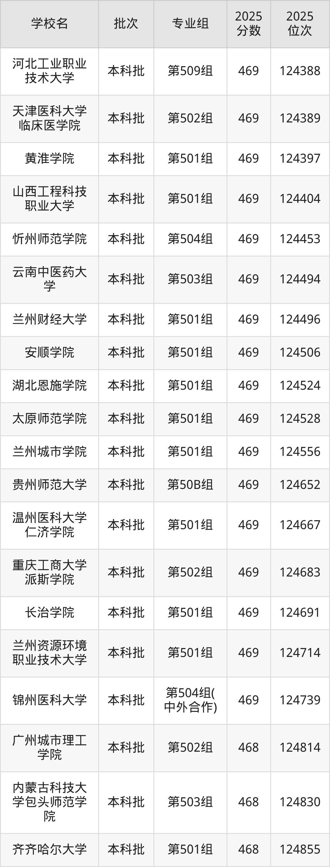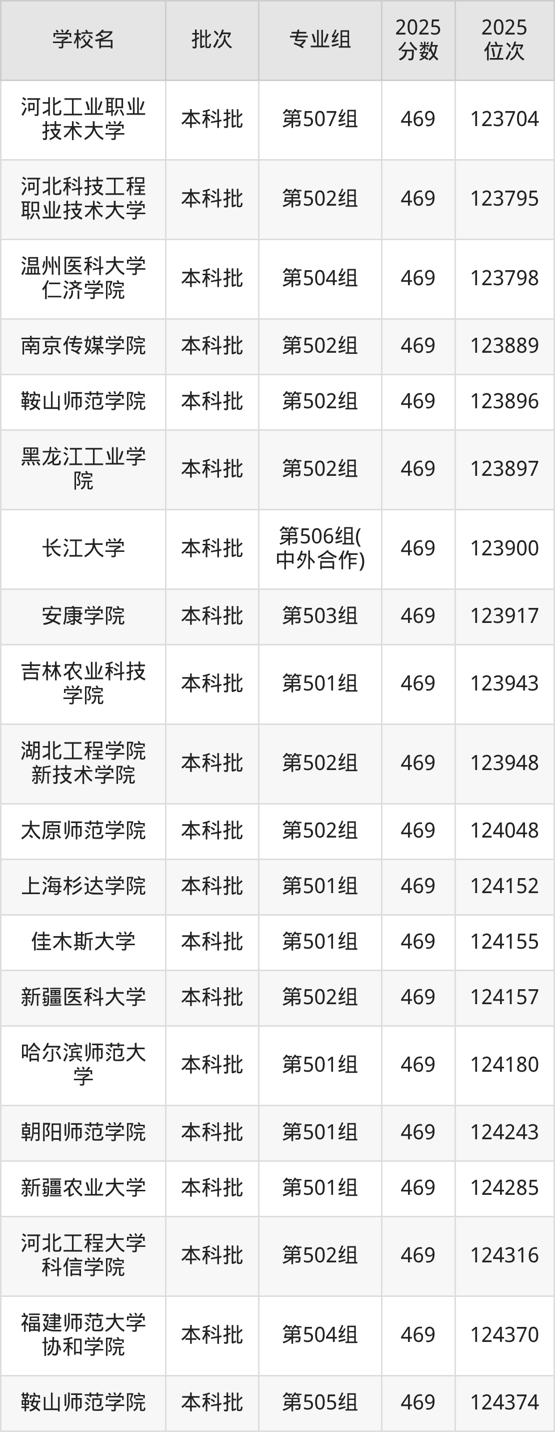 2025年江西高考物理类469分(123428名~124774名)能上的大学有哈尔滨师范大学第501组、贵州师范大学第50B组、河北科技工程职业技术大学第502组、河北工业职业技术大学第507组等。