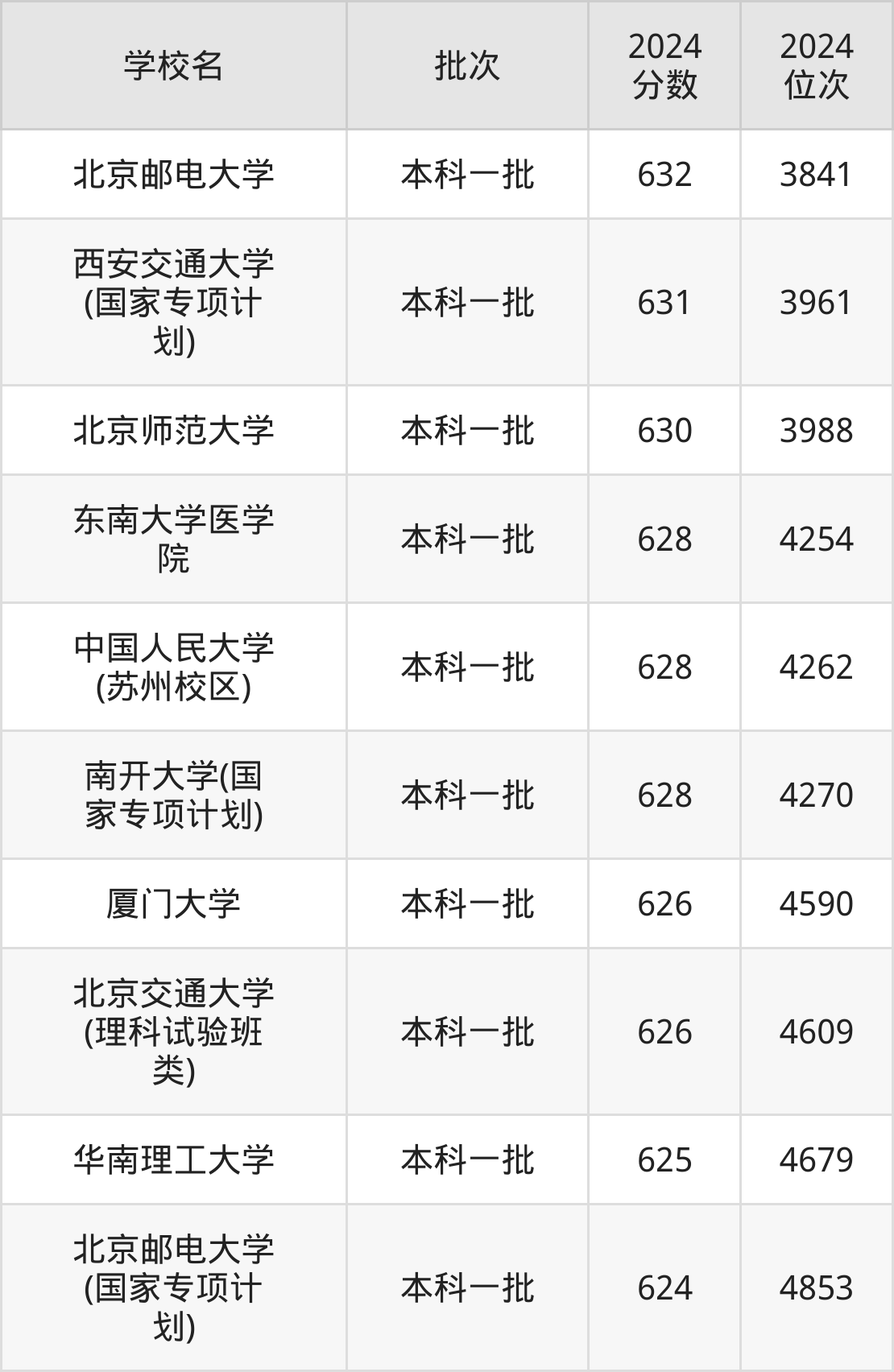 2024年陕西高考理科628分(4245名~4391名)能上的大学有中国人民大学(苏州校区)、东南大学医学院、南开大学(国家专项计划)。