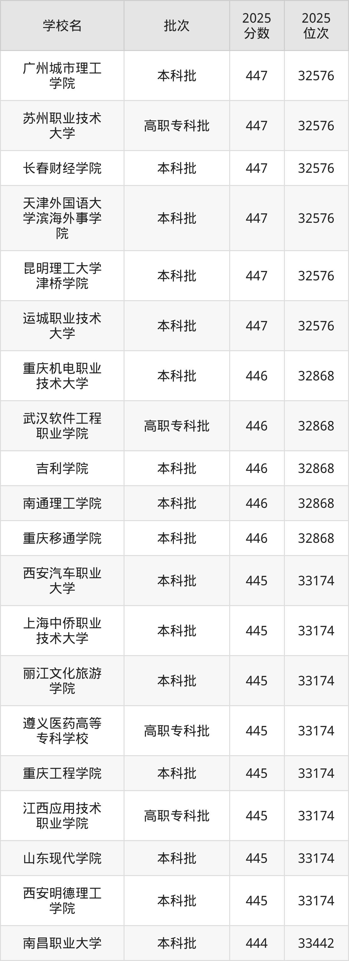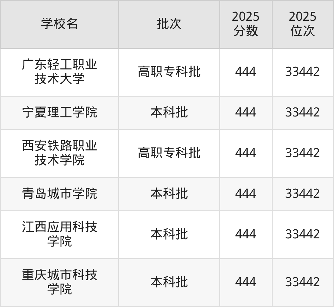2025年重庆高考历史类445分(32869名~33174名)能上的大学有西安明德理工学院、山东现代学院、江西应用技术职业学院、重庆工程学院等。