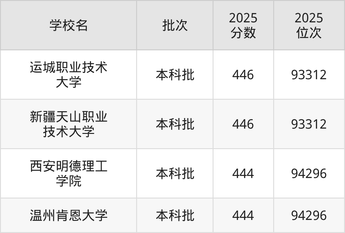 2025年重庆高考物理类445分(93313名~93815名)录取位次低于该区间(较稳妥)的有温州肯恩大学(94296名)、西安明德理工学院(94296名)等;录取位次高于该区间(可冲)的有新疆天山职业技术大学(93312名)、运城职业技术大学(93312名)等。