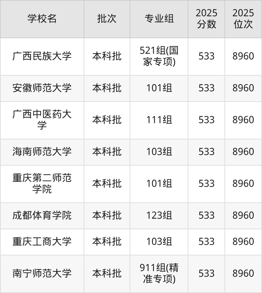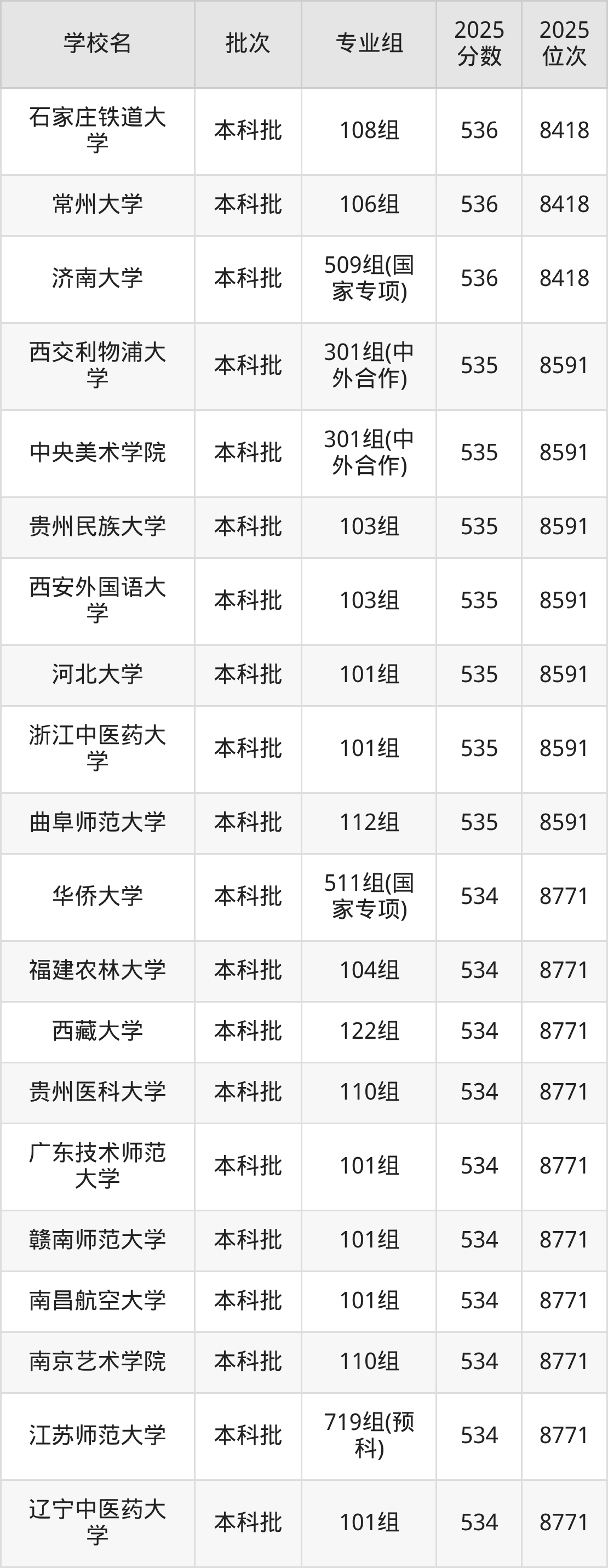 2025年广西高考历史类535分(8419名~8591名)能上的大学有中央美术学院301组(中外合作)、河北大学101组、浙江中医药大学101组、曲阜师范大学112组等。