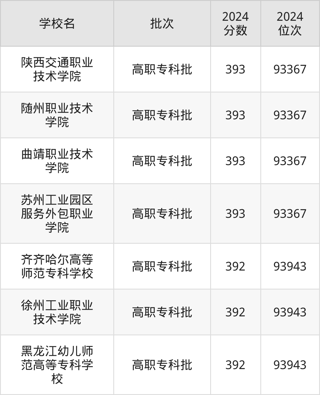 2024年云南高考文科392分(93368名~93943名)能上的大学有黑龙江幼儿师范高等专科学校、齐齐哈尔高等师范专科学校、徐州工业职业技术学院。