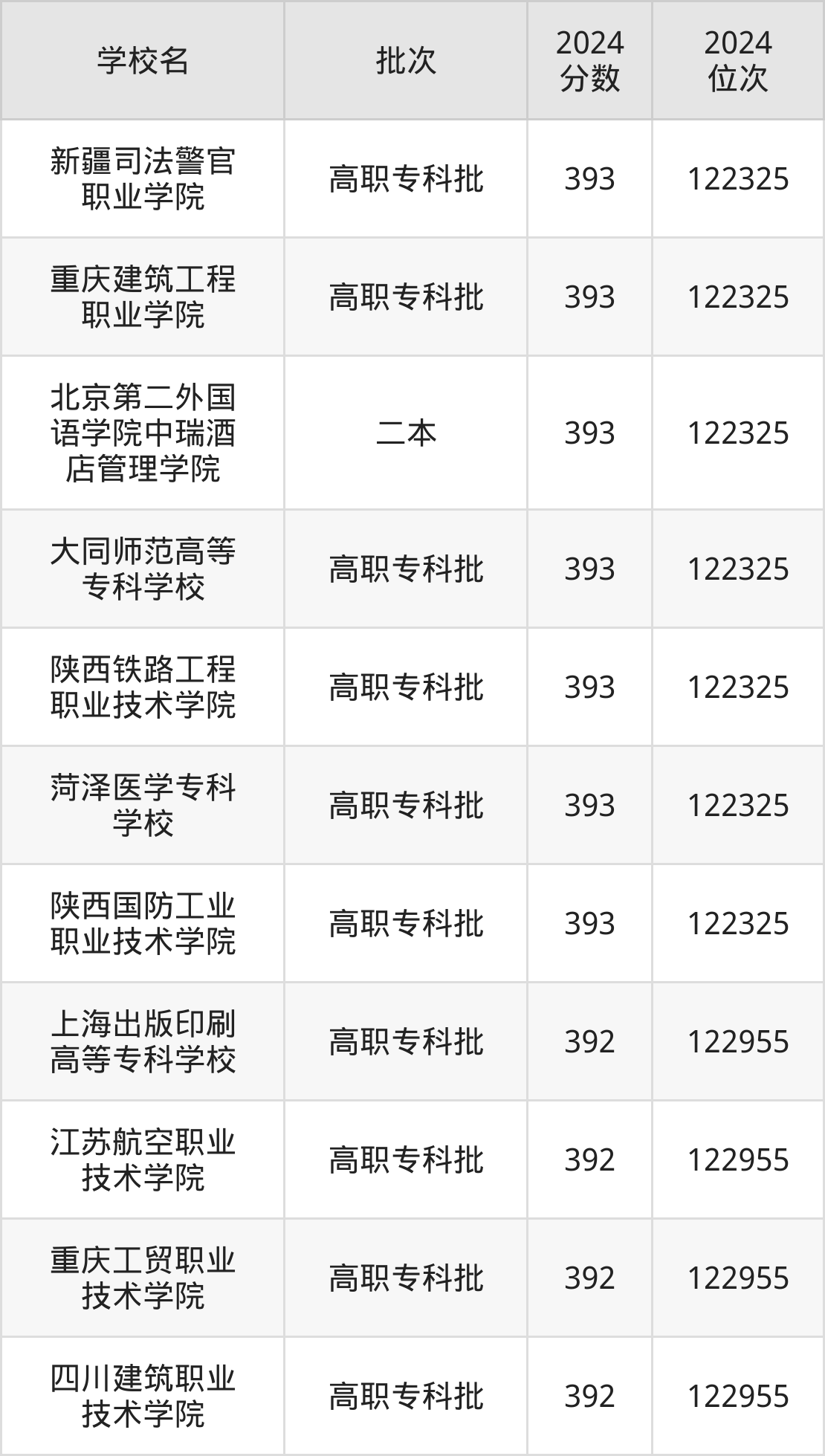2024年云南高考理科392分(122326名~122955名)能上的大学有江苏航空职业技术学院、重庆工贸职业技术学院、四川建筑职业技术学院、上海出版印刷高等专科学校。