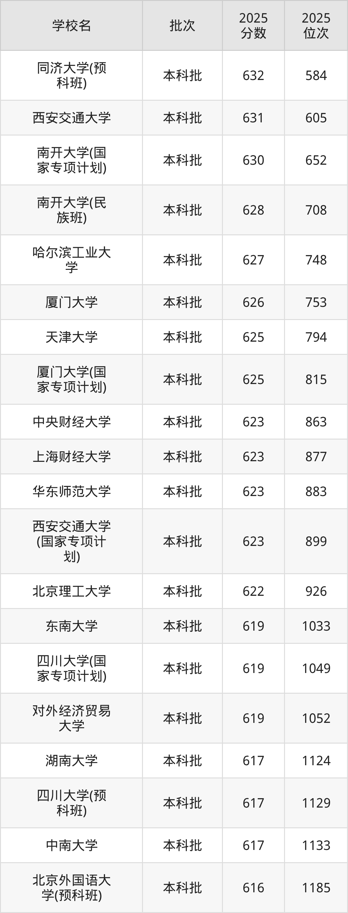 2025年贵州高考历史类619分(1020名~1068名)能上的大学有对外经济贸易大学、东南大学、四川大学(国家专项计划)。