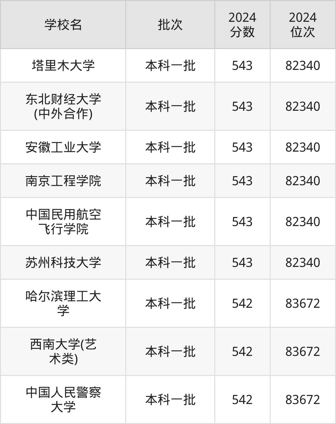 这些都是2025年高考文科15333名~15720名考生可以报考的大学,更多学校名单如下表所示: